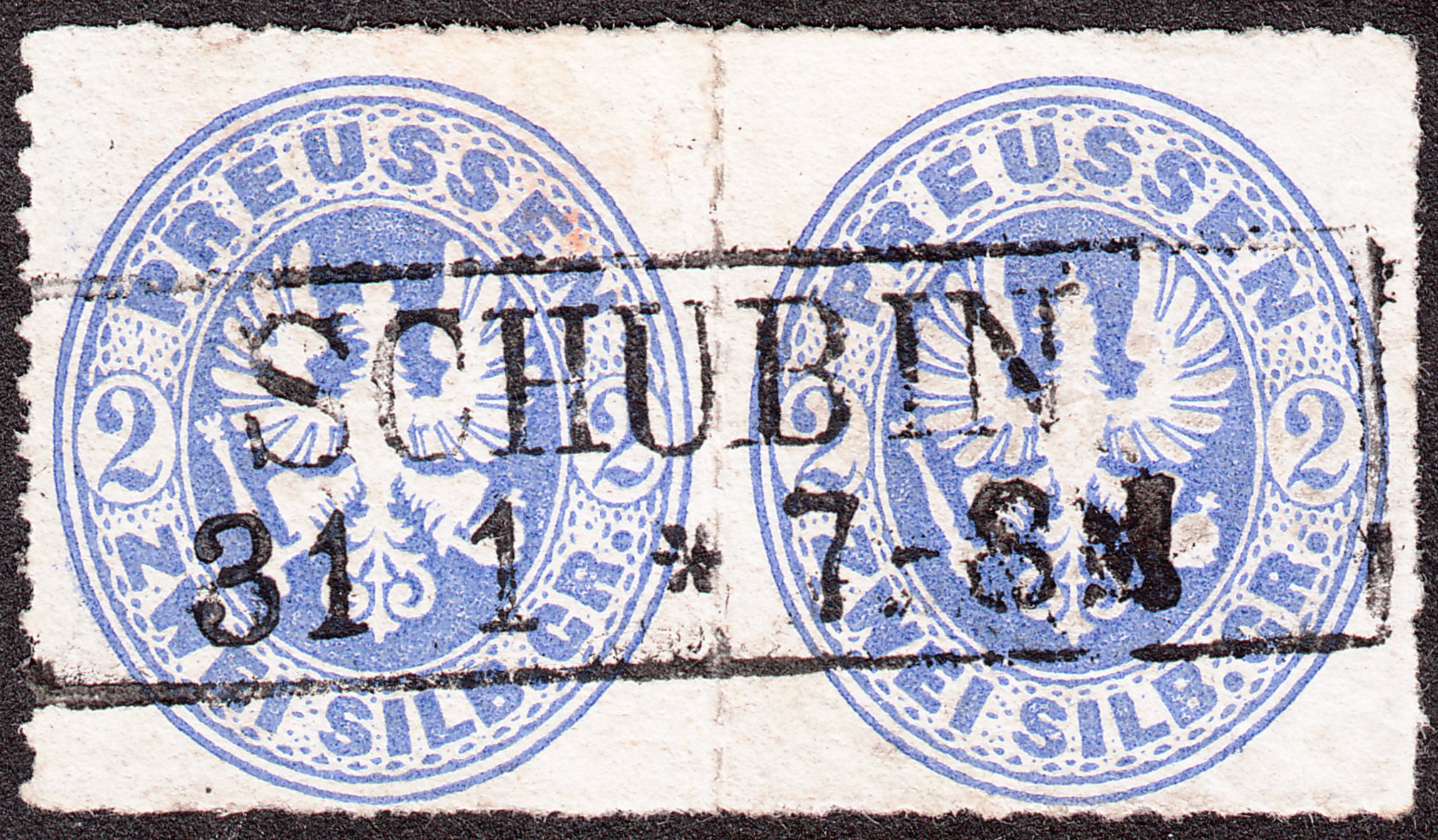 MiNr. 17 Paar mit Rahmenstempel SCHUBIN, entwertet an einem "31.01." mit Stundenangabe "7 - 8 N":