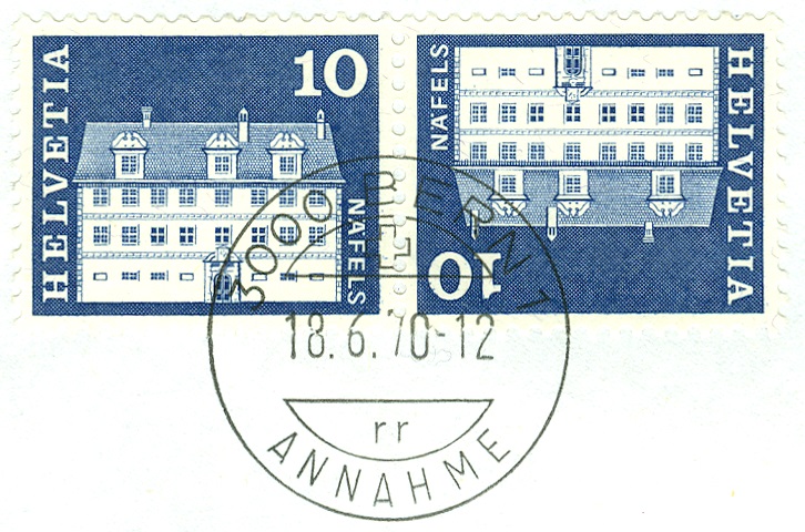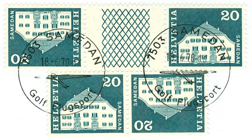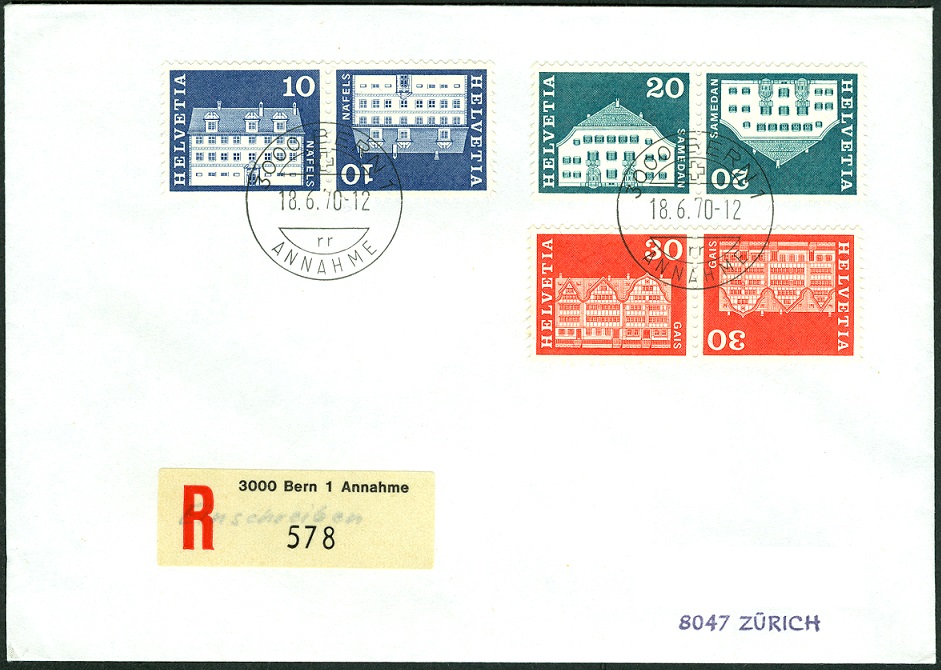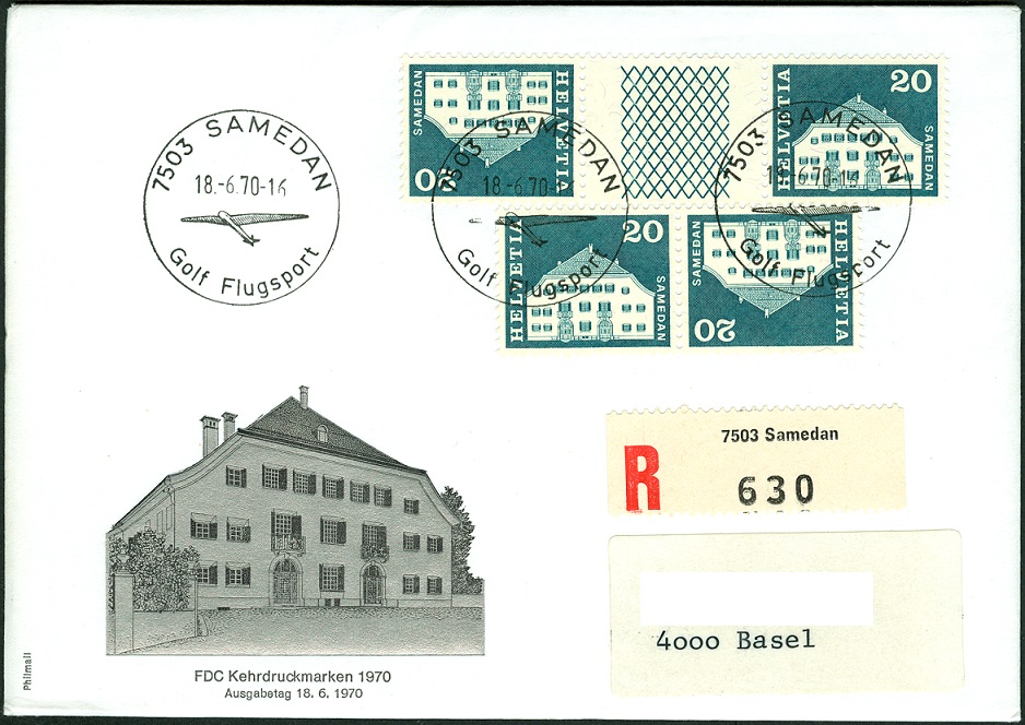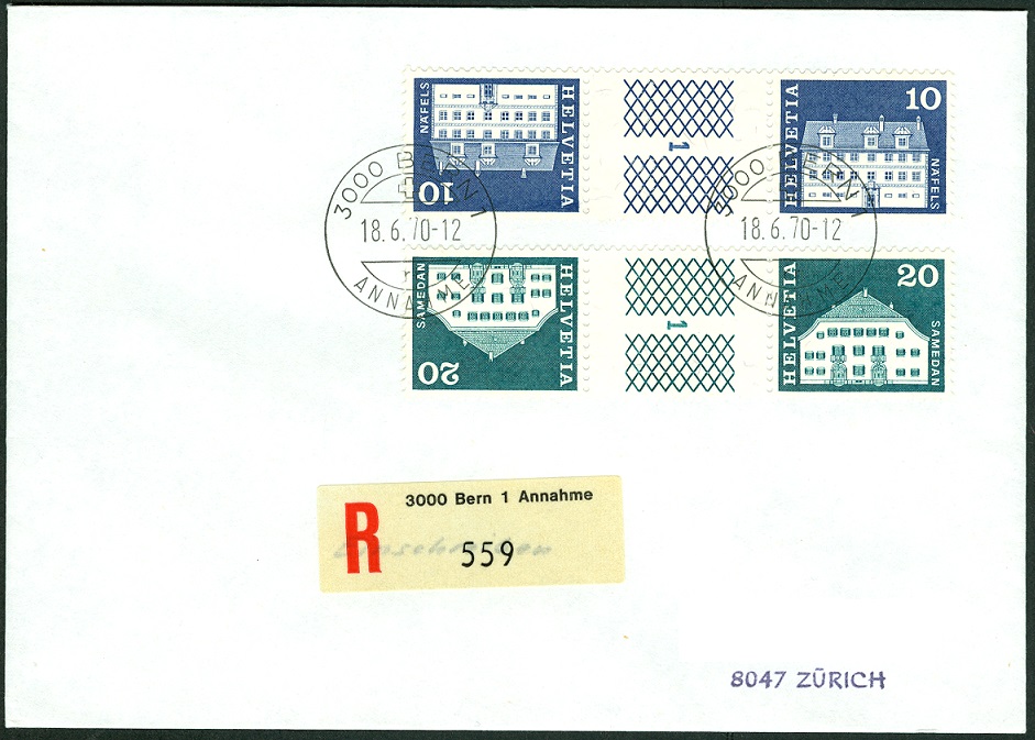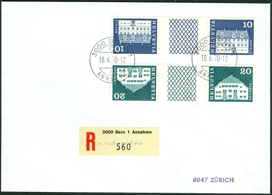 Bei diesem echt gelaufenen innerschweizerischen R-Brief wurden nur Kehrdruck"paare" mit einem Zwischenstück verklebt. Die Zwischenfelder sind ohne Ziffer(n).