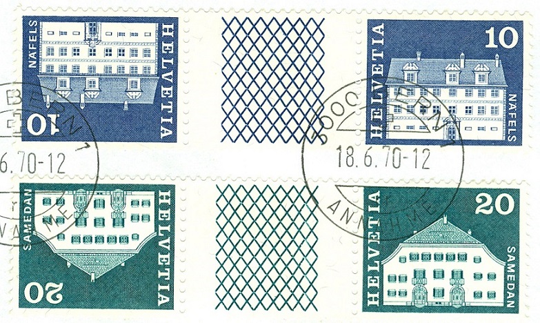 Der nächste Umschlag mit der 40-Rappen-Marke zeigt ein Beispiel mit bedrucktem Zwischenfeld in Markengröße. Wieder wurden die Marken mit einem Berner Ersttagsstempel entwertet.