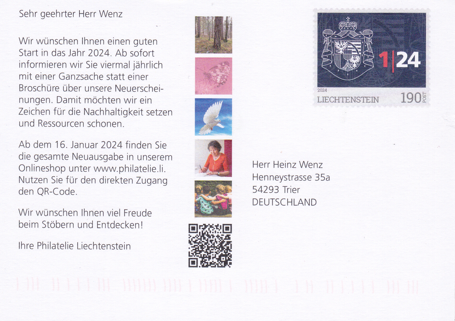 Die Versandstelle der Post in Liechtenstein ("Philatelie Liechtenstein") hat bis Ende 2023 vierteljährlich eine Broschüre mit der Vorstellung der jeweiligen Neuheiten im Umschlag die Abonnenten und Interessierten Sammler verschickt. Dieser Service wurde mit Beginn des Jahres 2024 eingestellt.