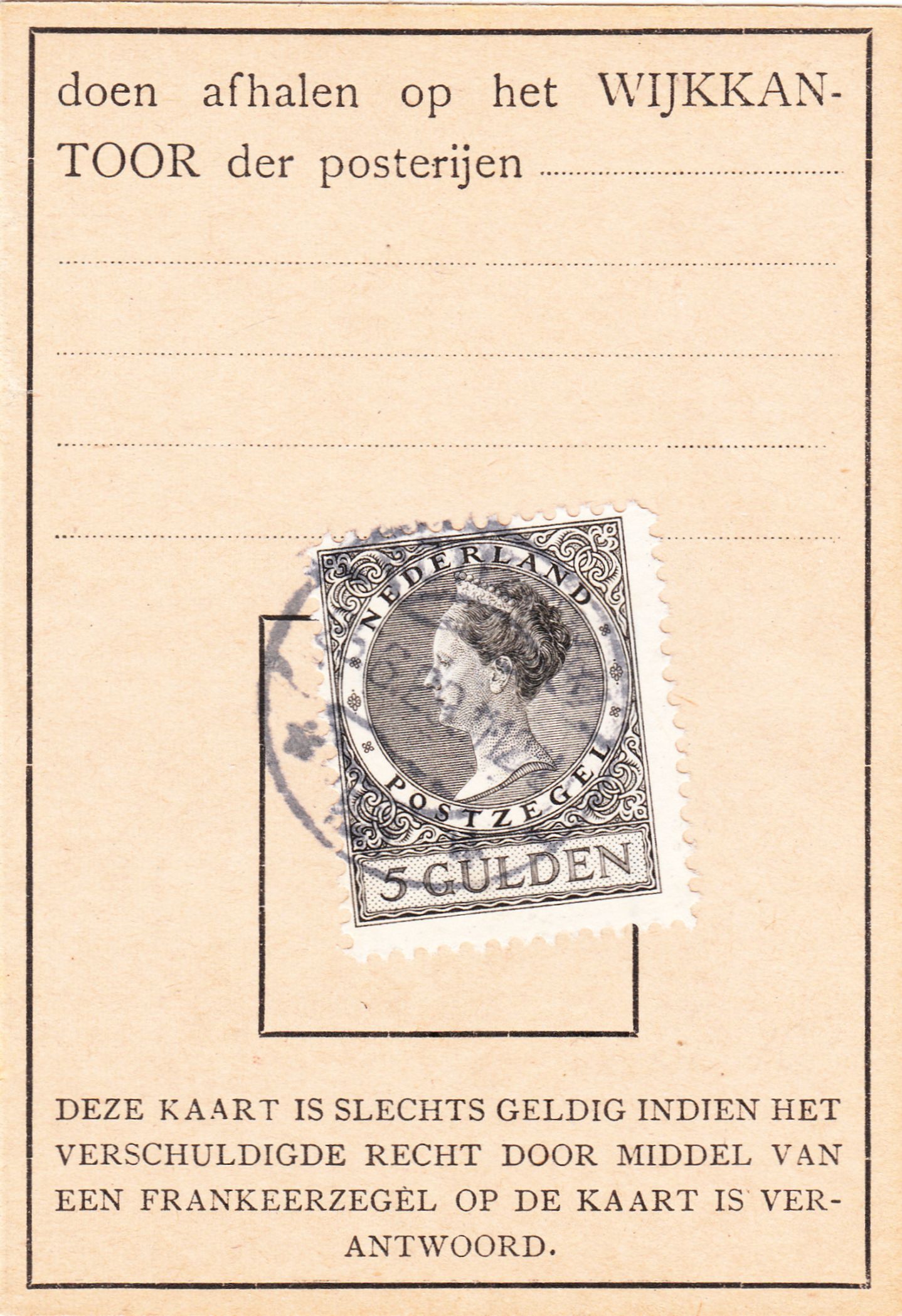 In diesem Falle wurde 1929 ein Postwertzeichen der Wertstufe zu 5 Gulden, MiNr. 170 A, als EF auf einem Abholausweis verklebt: