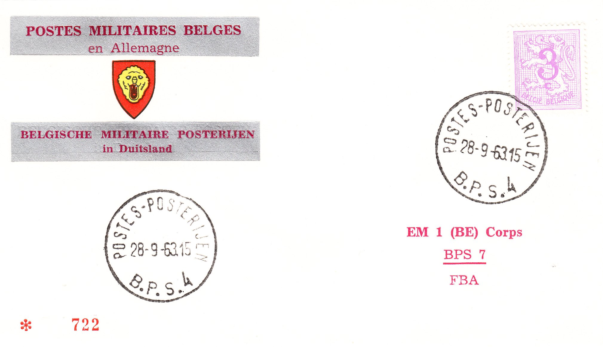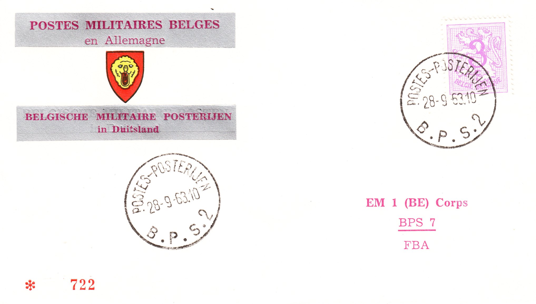 Hier ein aus einem Abonnement stammender Beleg des vom 01.12.1959 bis 1992 in Eschweiler Camp Zeebrugge stationierten B.P.S 2 vom 28.09.1963 mit Tagesstempel Typ K: