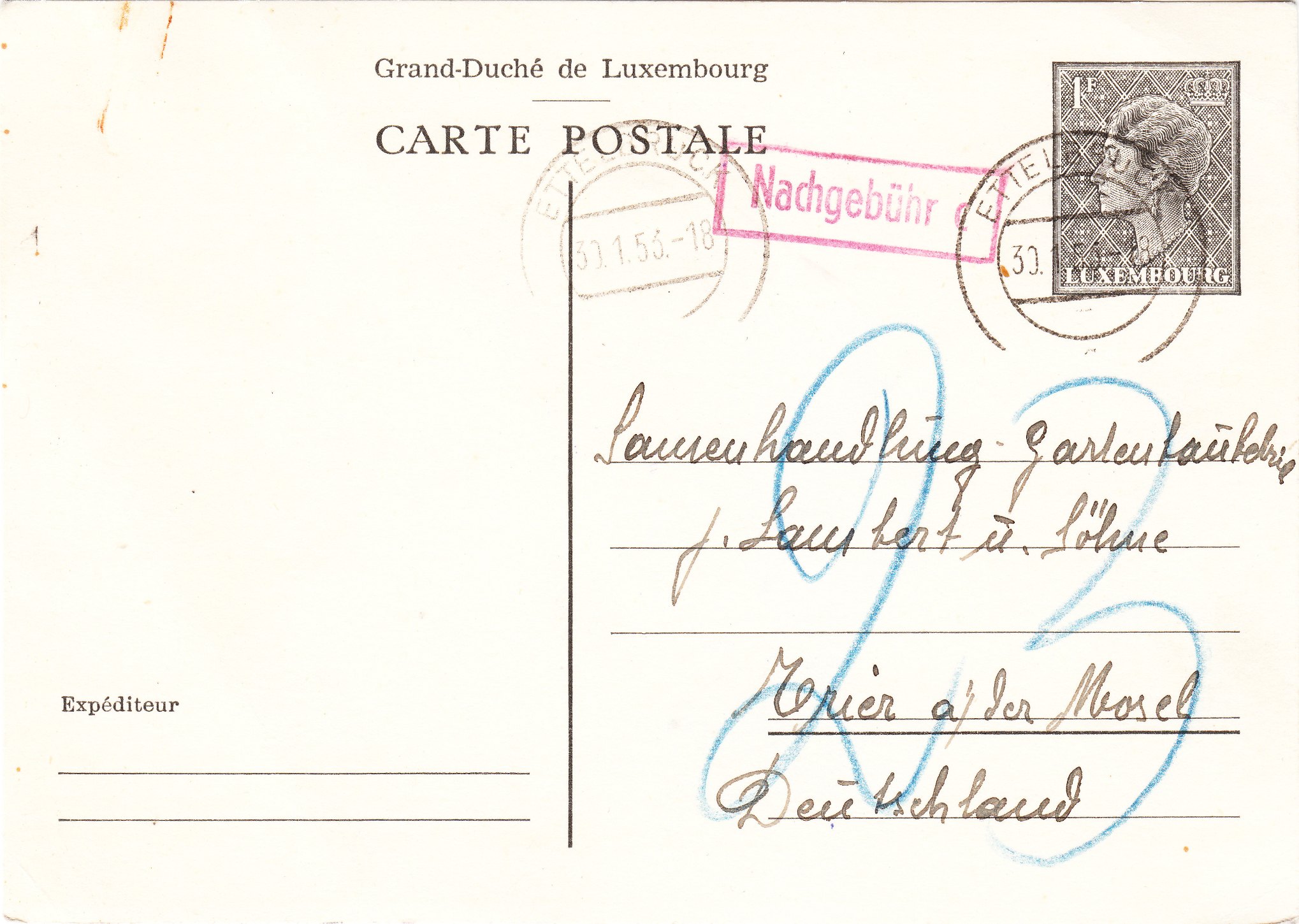 Eine Postkarte von Luxemburg nach Deutschland kostete 1953 ein Porto von 2,50 Francs: