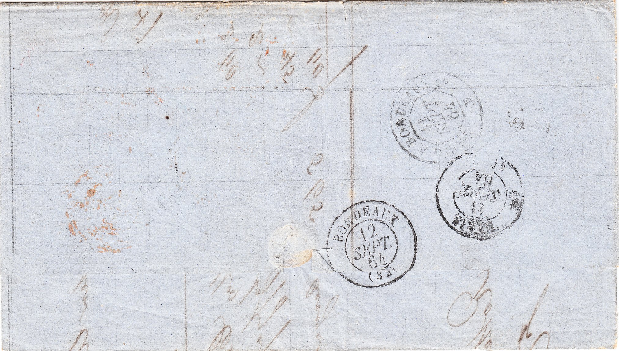 Laut den rückseitigen Stempeln lief dieser Beleg am 11.09.1864 über Paris per Bahnpost Paris - Bordeaux nach Bordeaux, wo er am 12.09.1864 ankam.