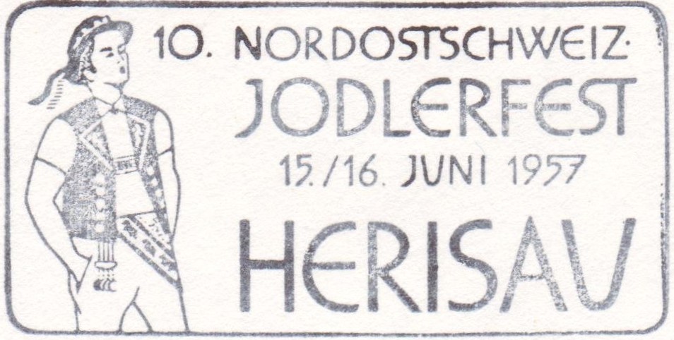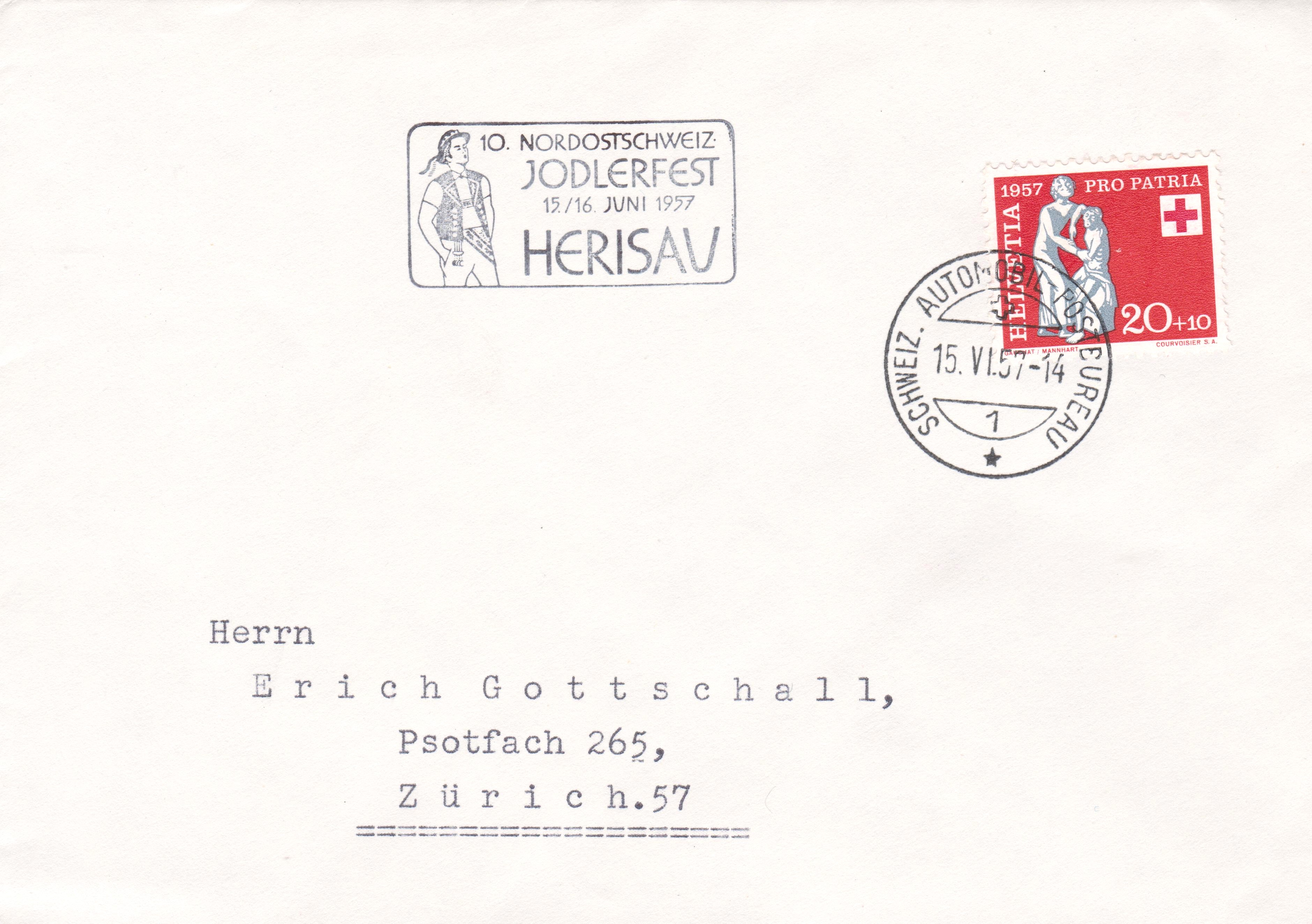 Dieser Brief wurde am 15.06.1957 um 14 Uhr aufgegeben beim "SCHWEIZ. AUTOMOBIL-POSTBUREAU 1" (= mobiles Postamt im Autobus) aus Anlaß "10. NORDOSTSCHWEIZ JODLERFEST 15./16. JUNI 1957 HERISAU":