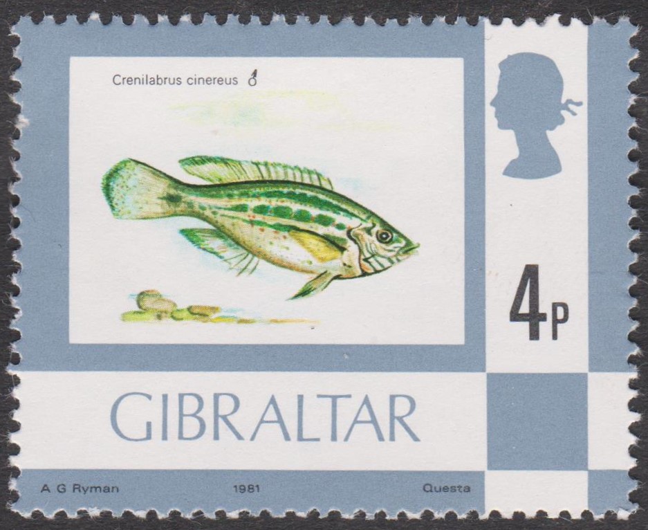 Gibraltar 353 III, 4 P, Motiv "Crenilabrus cinereus" (= Grauer Lippfisch), mit Jahreszahl "1981":