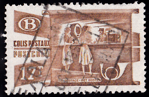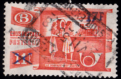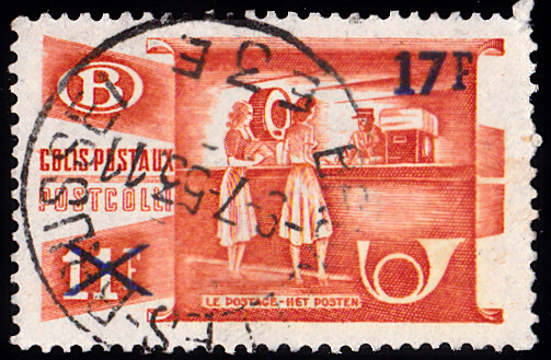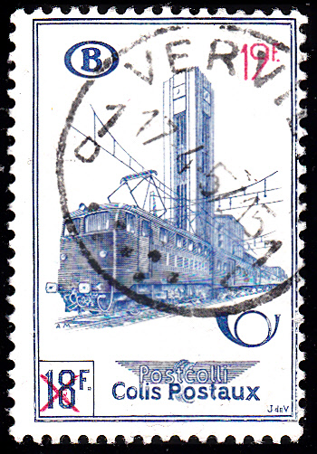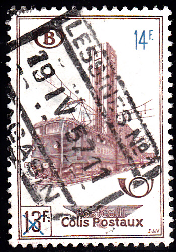 AM 1.10.1956 wurden die Postpaketmarken der Serie "Bahnhöfe" aus dem Jahre 1954 mit der Abbildung "Elektrischer Zug vor Bahnhof Brüssel-Nord" mit einem farbigem Bdr.-Aufdruck des neuen Wertes versehen. Hier die Marke der Wertstufe 14 Francs auf 13 Francs (MiNr 44, Urmarke MiNr 41):
