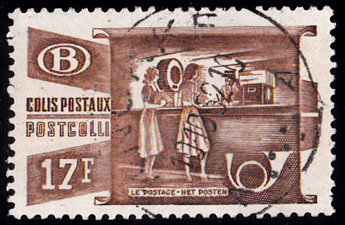 In der Serie "Postalltag" sind 1951 weitere Marken erschienen. Hier die Marke zu 17 Francs mit dem Motiv "Paketannahme", die die MiNr 35 hat. Hier eine Marke mit einem Bahnstempel entwertet.
