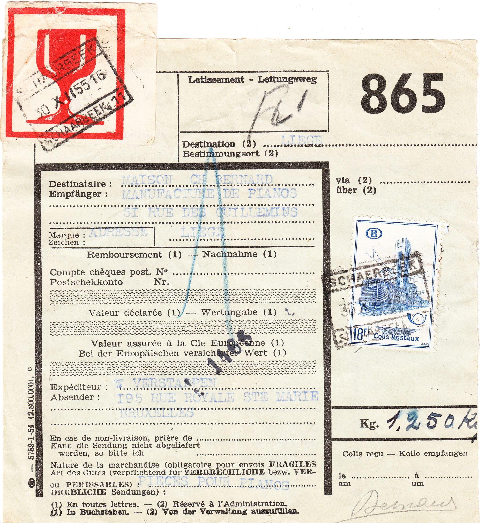 Hier eine EF auf einer Paketkarte für einen Transport von 1,250 kg "PIECES POUR PIANOS", also Ersatzteilen für ein Klavier: