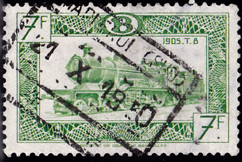 Diese Eisenbahnpaketmarke aus der Ausgabe von 1949 mit Abbildungen von "Belgische Lokomotiven" in der Wertstufe zu 8 Franc ist als MiNr. 286 katalogisiert. Die Marke gibt es in zwei Zähnungen: A = gez. K 12 1/2:12 1/4 und C = gez. K 12:12 1/4.