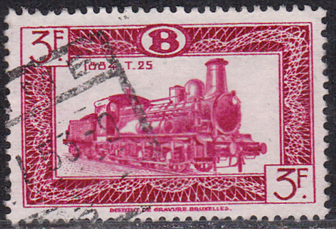 Diese Eisenbahnpaketmarke aus der Ausgabe von 1949 mit Abbildungen von "Belgische Lokomotiven" in der Wertstufe zu 3 Franc ist als MiNr. 281 katalogisiert. Die Marke gibt es in zwei Zähnungen: A = gez. K 12 1/2:12 1/4 und C = gez. K 12:12 1/4.
