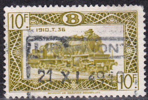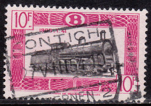 Diese Eisenbahnpaketmarke aus der Ausgabe von 1949 mit Abbildungen von "Belgische Lokomotiven" in der Wertstufe zu 10 Franc ist als MiNr. 289 katalogisiert. Die Marke gibt es in zwei Zähnungen: A = gez. K 12 1/2:12 1/4 und C = gez. K 12:12 1/4.
