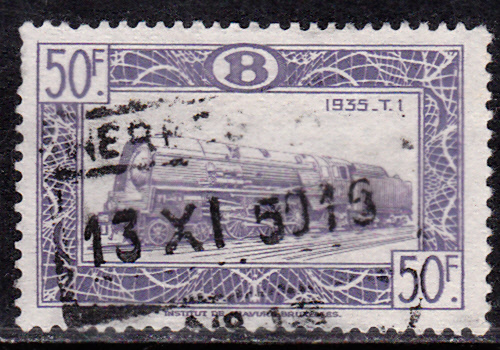Diese Eisenbahnpaketmarke aus der Ausgabe von 1949 mit Abbildungen von "Belgische Lokomotiven" in der Wertstufe zu 50 Franc ist als MiNr. 293 katalogisiert. Die Marke gibt es in zwei Zähnungen: A = gez. K 12 1/2:12 1/4 und C = gez. K 12:12 1/4.
