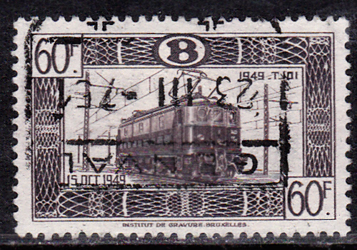 Diese Eisenbahnpaketmarke aus dem Jahr 1949 zur Eröffnung der elektrifizierten Strecke Brüssel-Charleroi zu 60 Franc ist als MiNr. 295 katalogisiert.