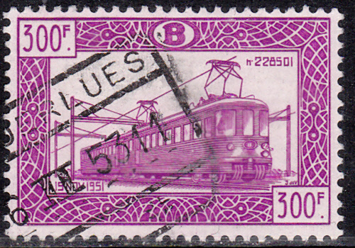 Diese Eisenbahnpaketmarke aus dem Jahr 1952 mit der Abbildung des Schnelltriebwagen Brüssel-Antwerpen Type 1951 zu 300 Franc ist als MiNr. 298 katalogisiert.