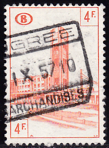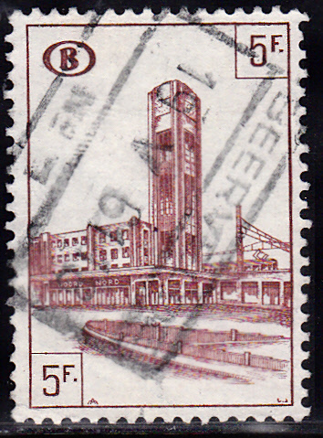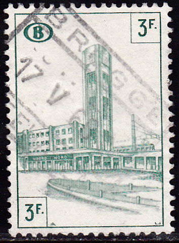 Diese Eisenbahnpaketmarke aus der Ausgabe von 1953/56 mit Abbildungen zur "Nord-Süd-Verbindung in Brüssel" in der Wertstufe zu 4 Franc mit der Abbildung "Bahnhof Brüssel Nord" ist als MiNr. 303 katalogisiert.
