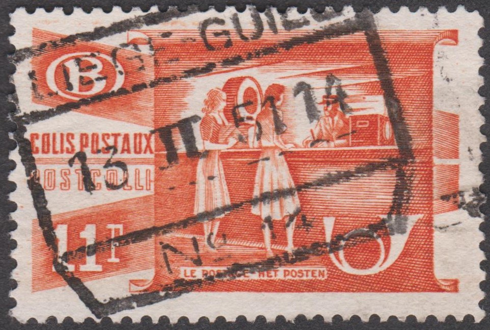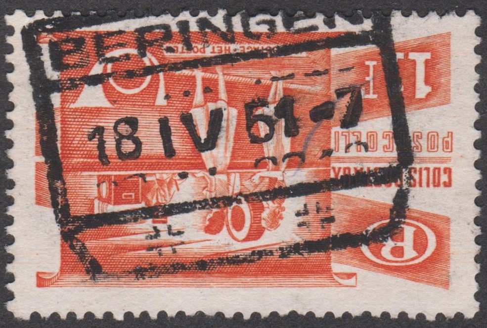 Postpaketmarke MiNr. 41, Wertstufe 13 F, erschien am 01.01.1954 und zeigt das Motiv "Elektrischer Zug vor Bahnhof Brüssel-Nord":