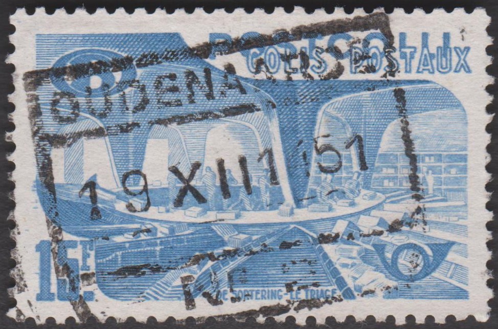 Postpaketmarke MiNr. 34, Wertstufe 15 F, erschien am 02.07.1951 und zeigt das Motiv "Paketsortierung":