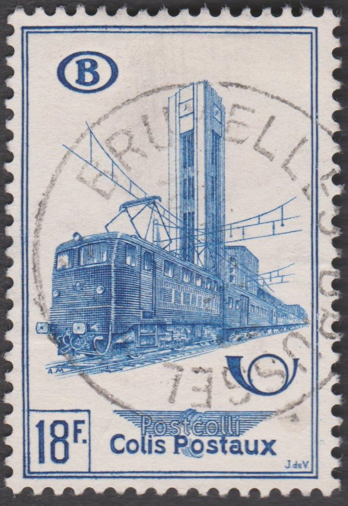 Postpaketmarke MiNr. 42, Wertstufe 18 F, erschien am 01.01.1954 und zeigt das Motiv "Elektrischer Zug vor Bahnhof Brüssel-Nord":