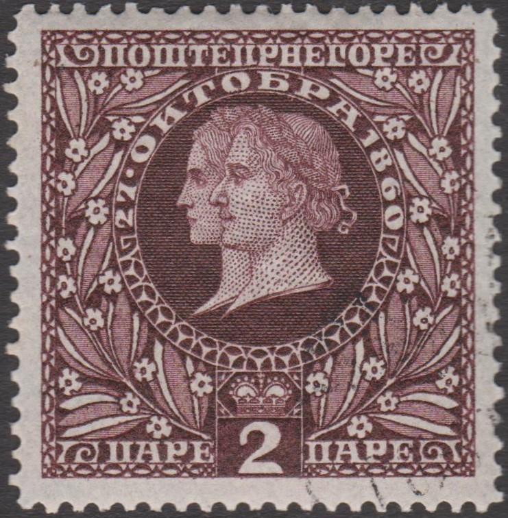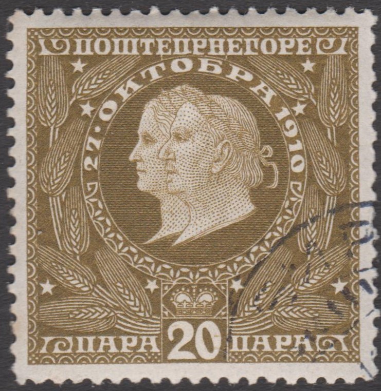 Montenegro MiNr. 79 erschien am 15.08.1910jul. (= 28.08.1910greg.) zur Krönung des Fürsten zum König und zeigt König Nikola I. und Königin Milena am 27.10.1910 = Goldene Hochzeit: