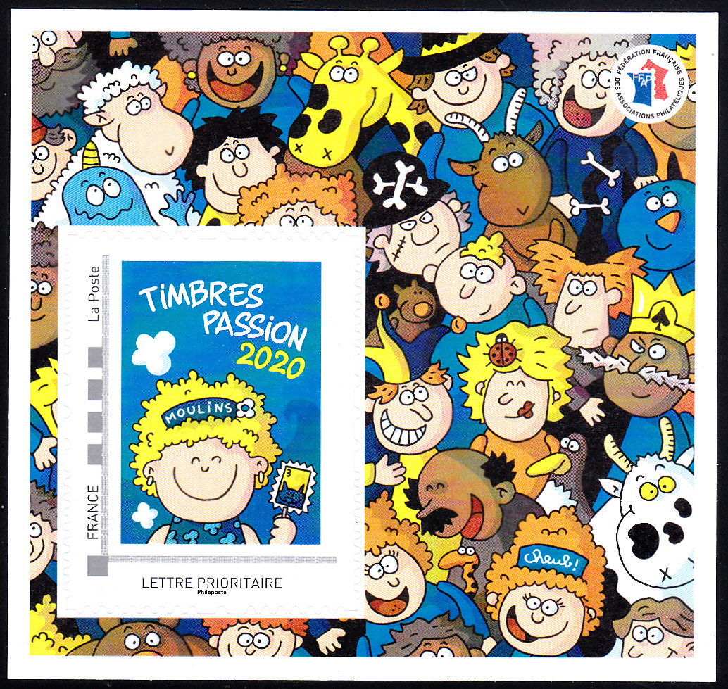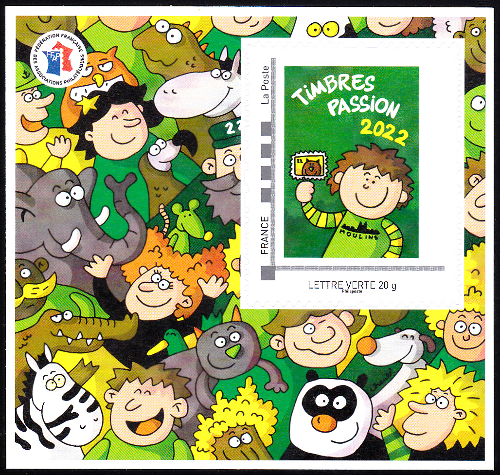 Da die 2020 geplante Briefmarkenausstellung "Timbres Passion 2020" in Moulins wegen Corona ausfallen musste und erst im Oktober 2022 stattfinden konnte, wurde eine Neuausgabe auf Privatbestellung in "Blockform" hergestellt. Hier zeige ich diesen mit einer Marke zum Tarif "Lettre verte 20g".