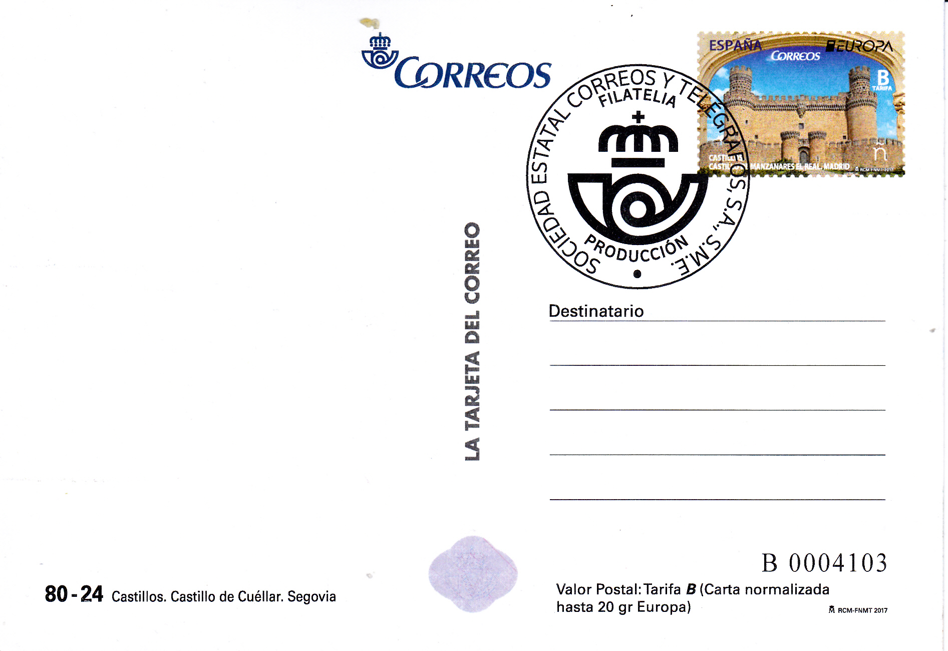 Ganzsachen-Postkarte im Tarif "B" (Karte Europa bis 20gr) mit einem Wertstempel im Muster der Europamarke 2017 (MiNr 5154) mit einer Abbildung der Burg Manzanares el Real in der Gemeinde Manzanares el Real.