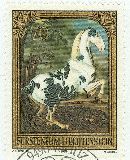 Hier die 70 Rappen-Marke auf einer so genannten MaxiCard. Es ist das Gemälde "Bildnis eines Schecken" von Joh. Georg von Hamilton und Ant. Faistenberger, oder auch nur ein Bildausschnitt des Gemäldes.