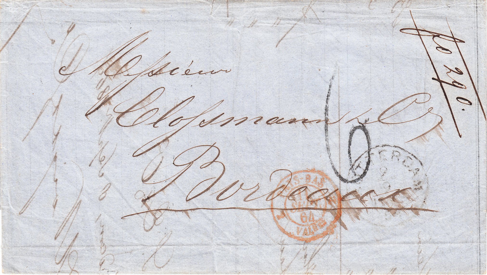 Dieser nach Bordeaux in Frankreich adressierte Brief wurde am 09.09.1864 in Rotterdam aufgegeben:
