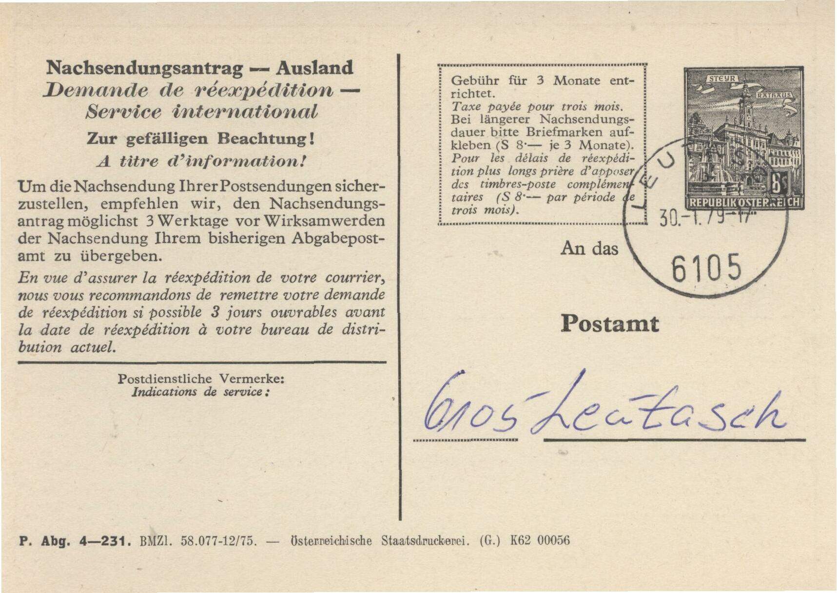 diese Nachsendeanträge gibt es sowohl für Inland als auch für Ausland. Ursprünglich waren es Ganzsachen mit eingedrucktem Wertstempel in Höhe der Gebühr für 3 Monate. Sollte die Post über einen längeren Zeitraum nachgesendet werden (z. B. bei Umzug), war die zusätzliche Gebühr mit Marken darzustellen. Später (ab 1980) gab es keinen Wertstempeleindruck mehr, nur noch den Textzusatz "Gebühr in Höhe von ... S für 3 Monate entrichtet". Per Definition sind das auch Ganzsachen. Der abgebildete Nachsendeantrag wurde ab 1966 herausgegeben. Es gibt verschiedene Vordruckvarianten. Näheres findet man im ANK-Ganzsachenkatalog, auch der Michel-Österreich-Spezial enthält ein Kapitel Ganzsachen.