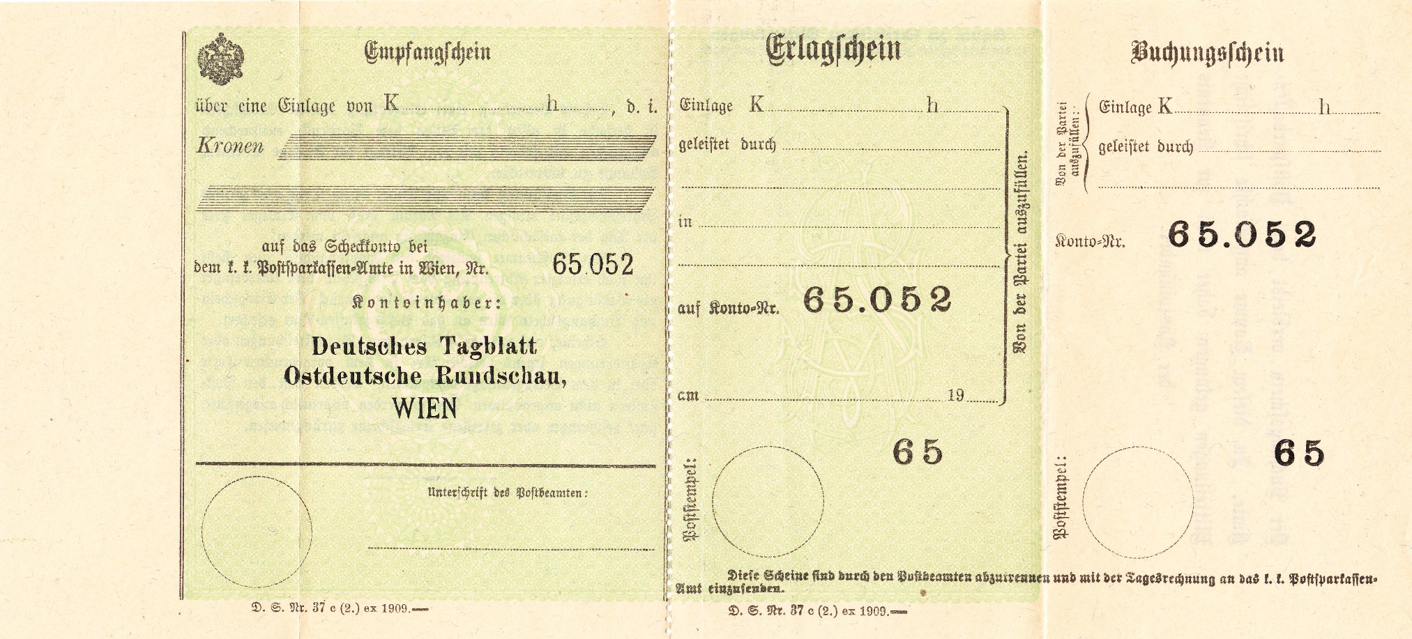 Hier ein Formular eines Einzahlungsscheins aus dem Jahre 1909 vom "k. k. Postsparkassen-Amte in Wien" als Vordruck "Kontoinhaber: Deutsches Tagblatt Ostdeutsche Rundschau. WIEN":