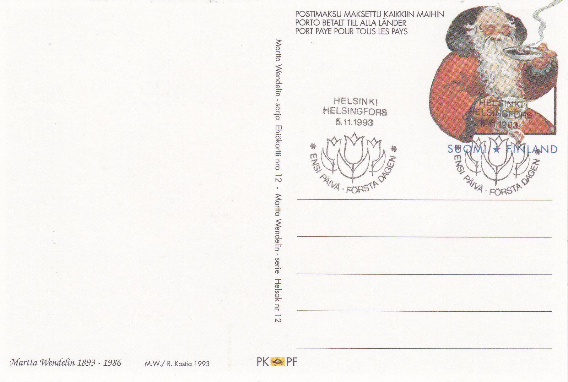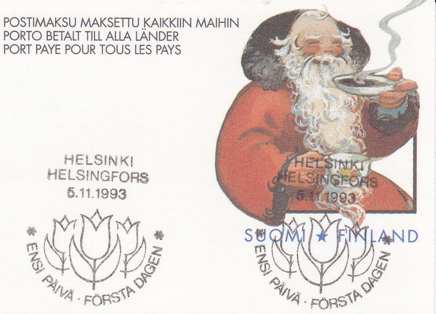 Es gibr auch noch eine dritte Ganzsache aus Finnland als Weihnachtskarte 1993, die ebenfalls auf der Bildseite eine Karte von Martta Wendelin zeigt. Hier einmal eine Karte mit dem dazugehörenden Ersttagsonderstempel.