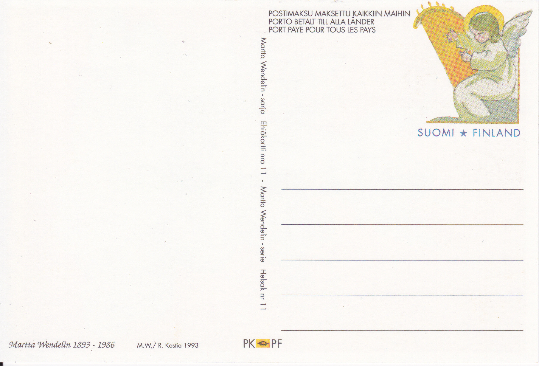 Bei der Finnischen Post gab es 1993 Weihnachtskarten als Ganzsachen. Hier eine Karte mit einer Engeldarstellung und einem der Engel als Wertstempel. Das Motiv der Karte stammt von Martta Wendelin (1893- 1986, einer finnischen Malerin).