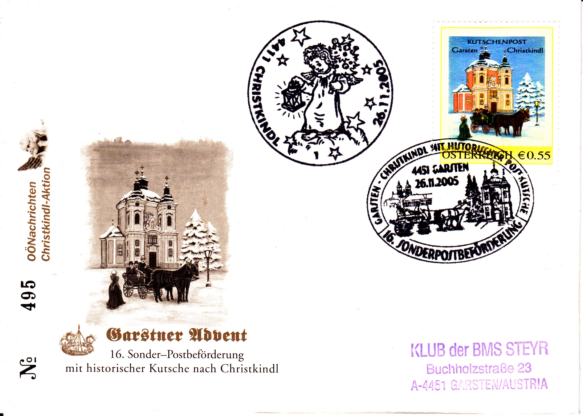 Brief von der 16. Sonderpostbeförderung mit Kutsche von A-4451 Garsten nach A-4411 Christkindl. Zur Frankatur wurde eine Marke aus dem Angebot der Österreichischen Post "Meine Marke" (MiNr 2456) mit Motiv "Gnadenkirche in Christkindl" benutzt. Die Marke wurde im Startort Garsten mit dem Sonderstempel zur Sonderpostbeförderung gestempelt. Der Brief erhielt in Christkindl den Sonderstempel aus Christkindl als Ankunftsstempel.