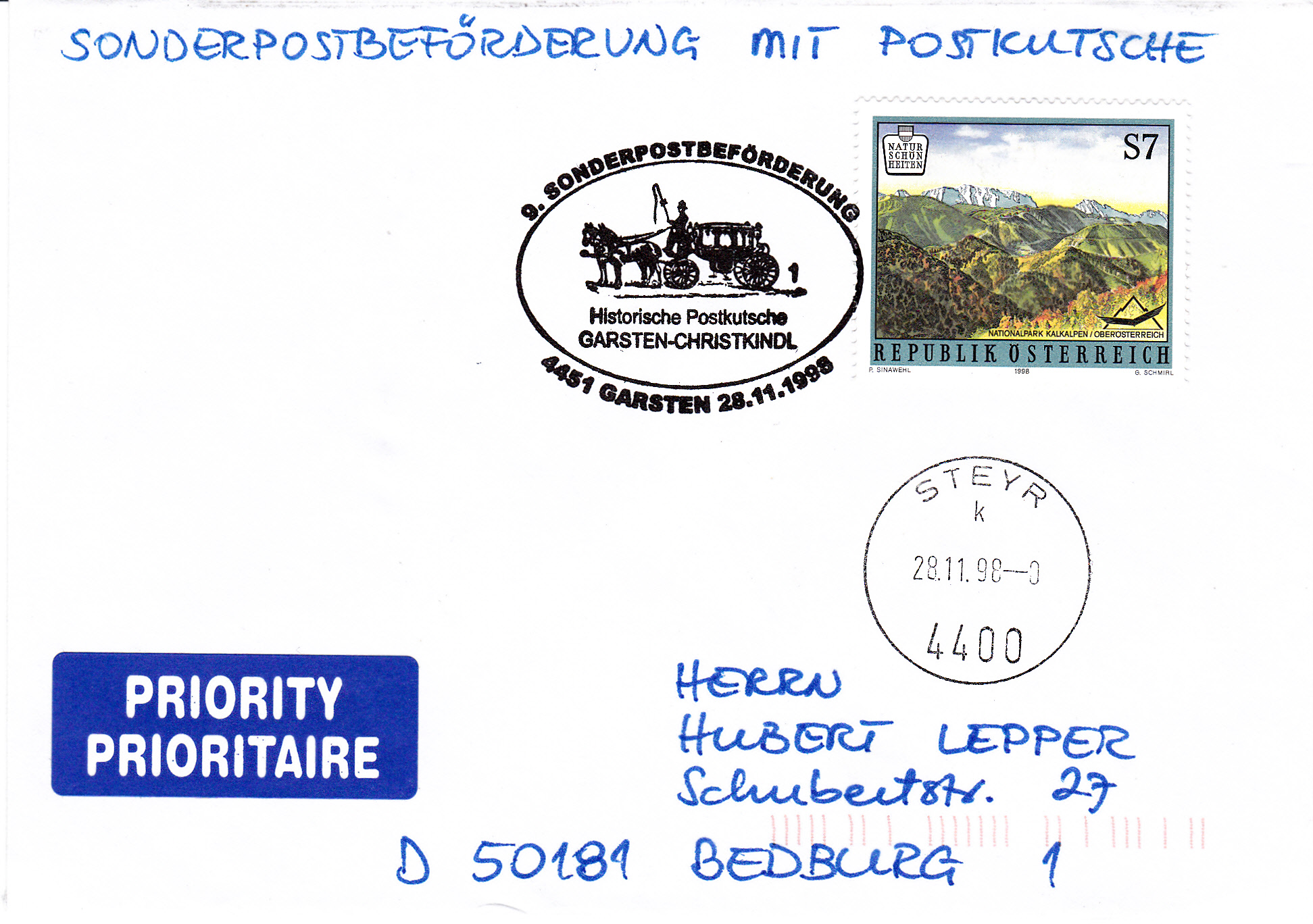 Brief von der 9. Sonderpostbeförderung mit einer historischen Postkutsche von A-4451 Garsten nach A-4411 Christkindl. Der Beleg erhielt neben dem Sonderstempel aus Garsten mit der Kennziffer "1" nach der Ankunft am Zielort einen weiteren Stempel in Steyr. Christkindl ist ein Ortsteil der Stadt Steyr.