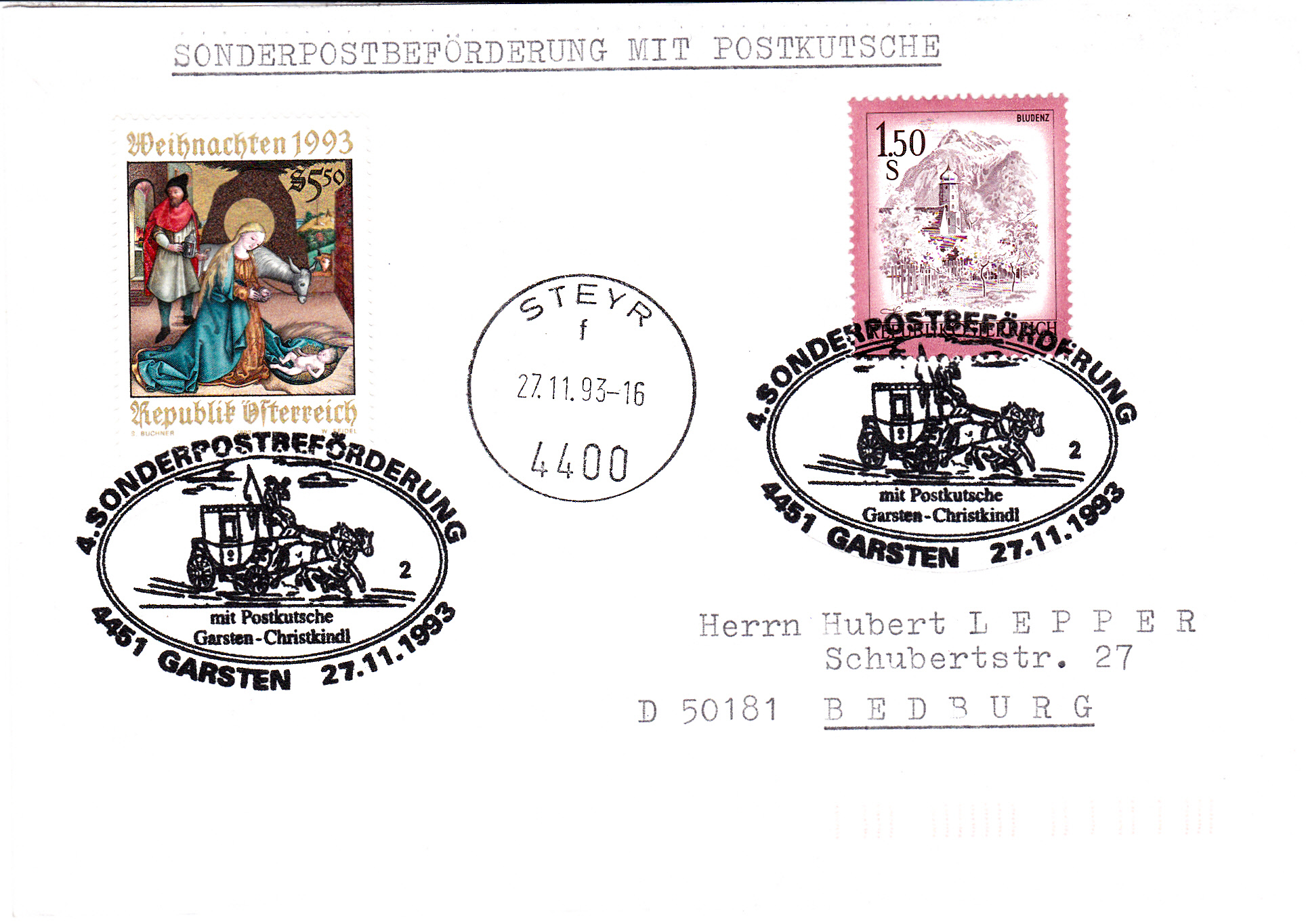 Brief von der 4. Sonderpostbeförderung mit einer historischen Postkutsche von A-4451 Garsten nach A-4411 Christkindl. Der Beleg erhielt neben dem Sonderstempel aus Garsten vom 27.11.1993 mit der Kennziffer "2" nach der Ankunft am Zielort einen weiteren Stempel in Steyr. Christkindl ist ein Ortsteil der Stadt Steyr.