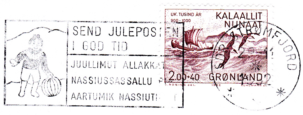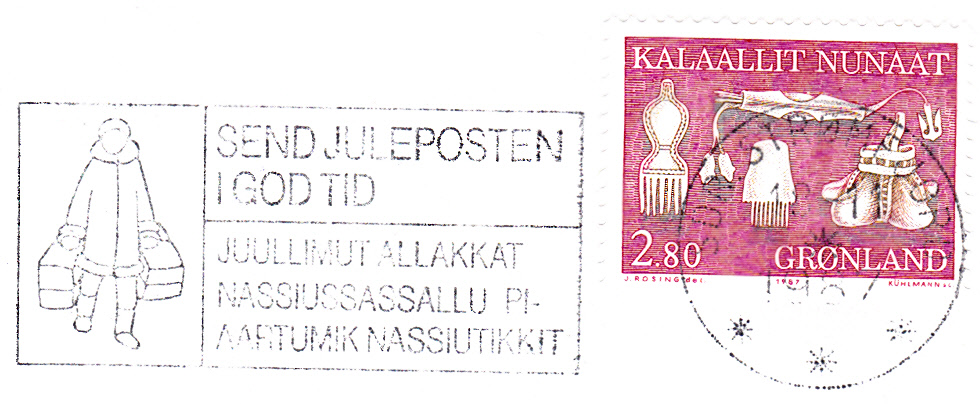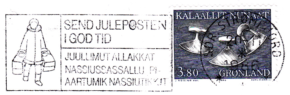 Maschinenwerbestempel vom 20.11.1986 aus Kangerlussuaq (Grönland), auf dänisch Søndre Strømfjord, mit dem Hinweis "Send Juleposten i god tid".