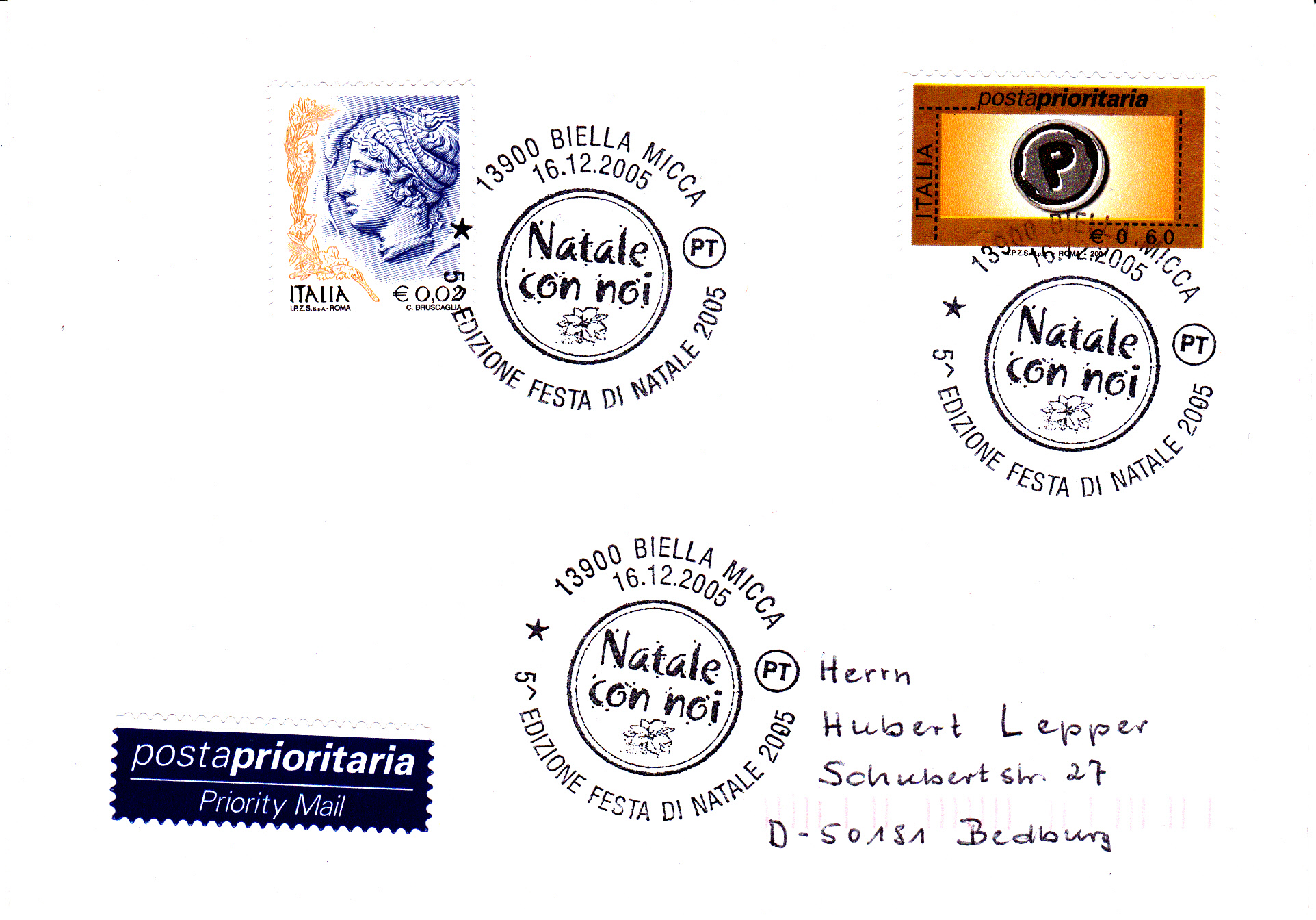 In diesem Sonderstempel aus I-13900 Bielle Micca vom 16.12.2005 ist unter der Schrift "Natale con noi" ("Weihnachten bei uns") ein Weihnachtsstern abgebildet.