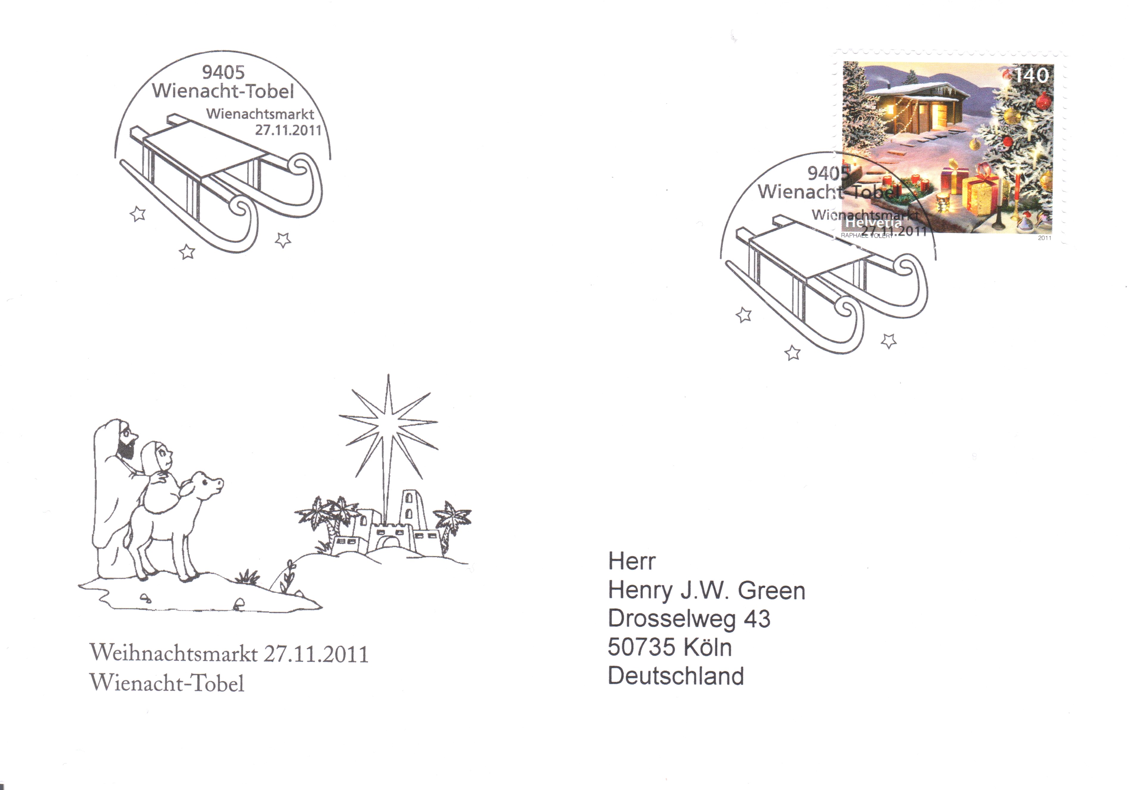 Sonderstempel mit einem Schlitten als Motiv zum Weihnachtsmarkt in 9405 Wienacht-Tobel in der Schweiz:
