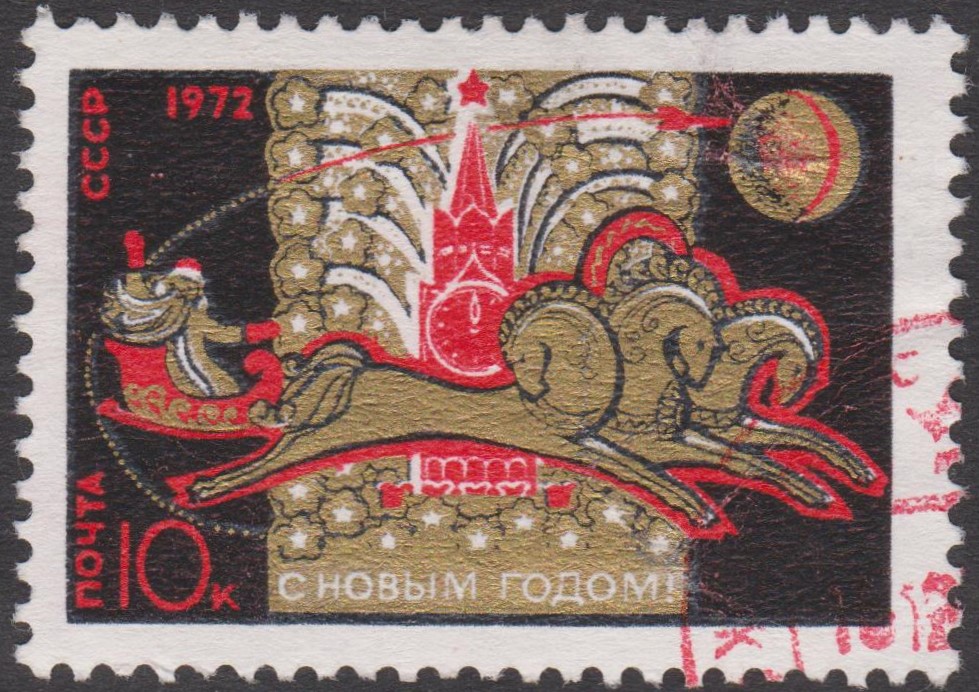Sowjetunion MiNr. 3923 erschien am 14.09.1971 zum Neujahr 1972 und zeigt eine Troika vor dem Kremlturm sowie eine stilisierte Rakete: