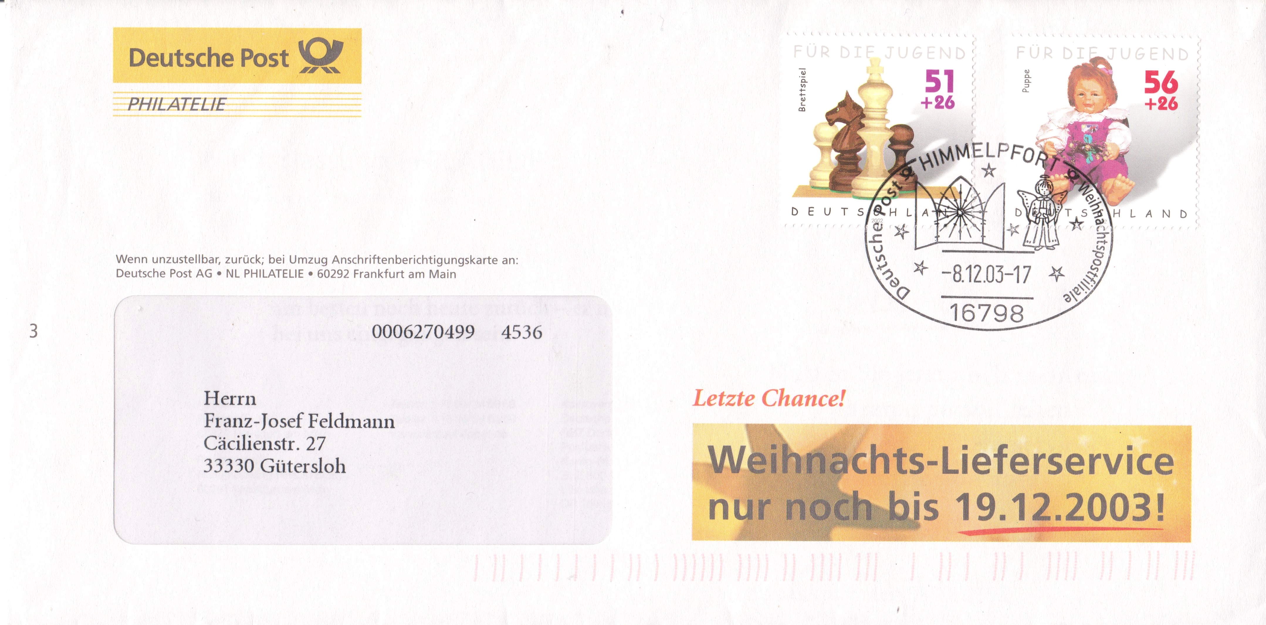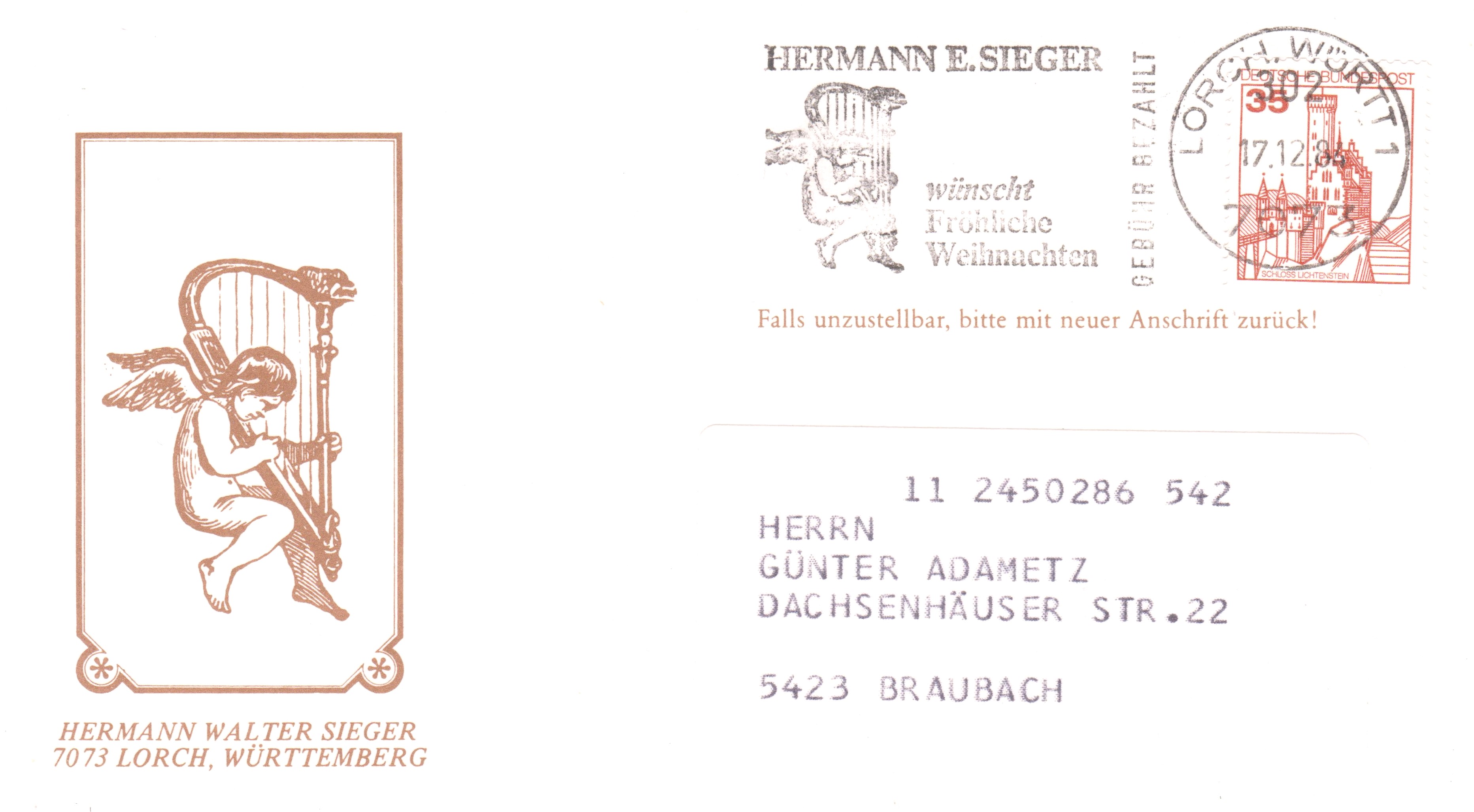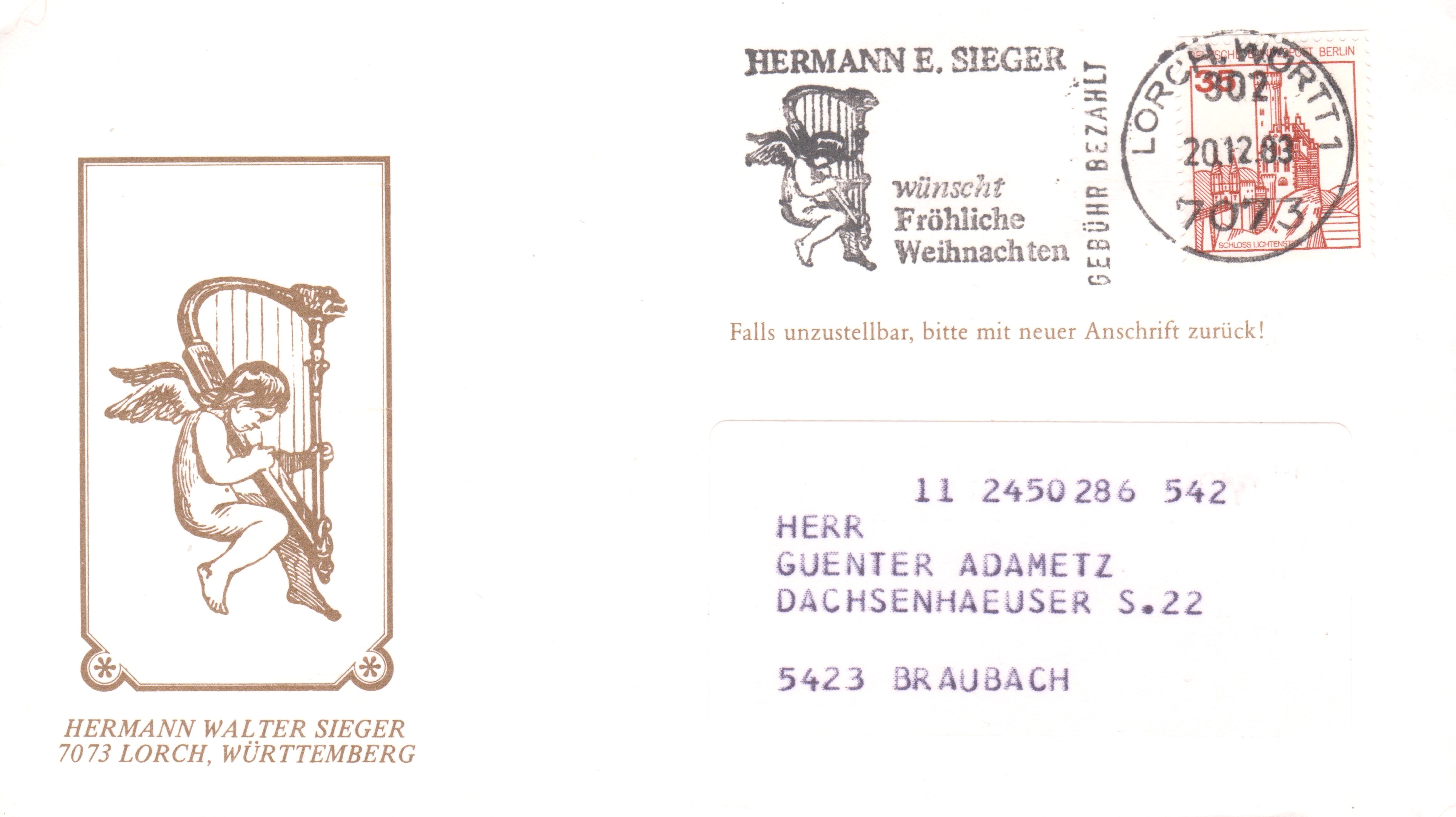 Die Firma SIEGER "wünscht Fröhliche Weihnachten" mit einem Harfe spielenden Weihnachtsengel auf diesem Absenderentwerterstempel, Portostufen 35 Pf aus 1983 und 1984: