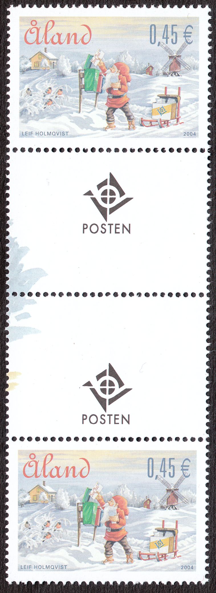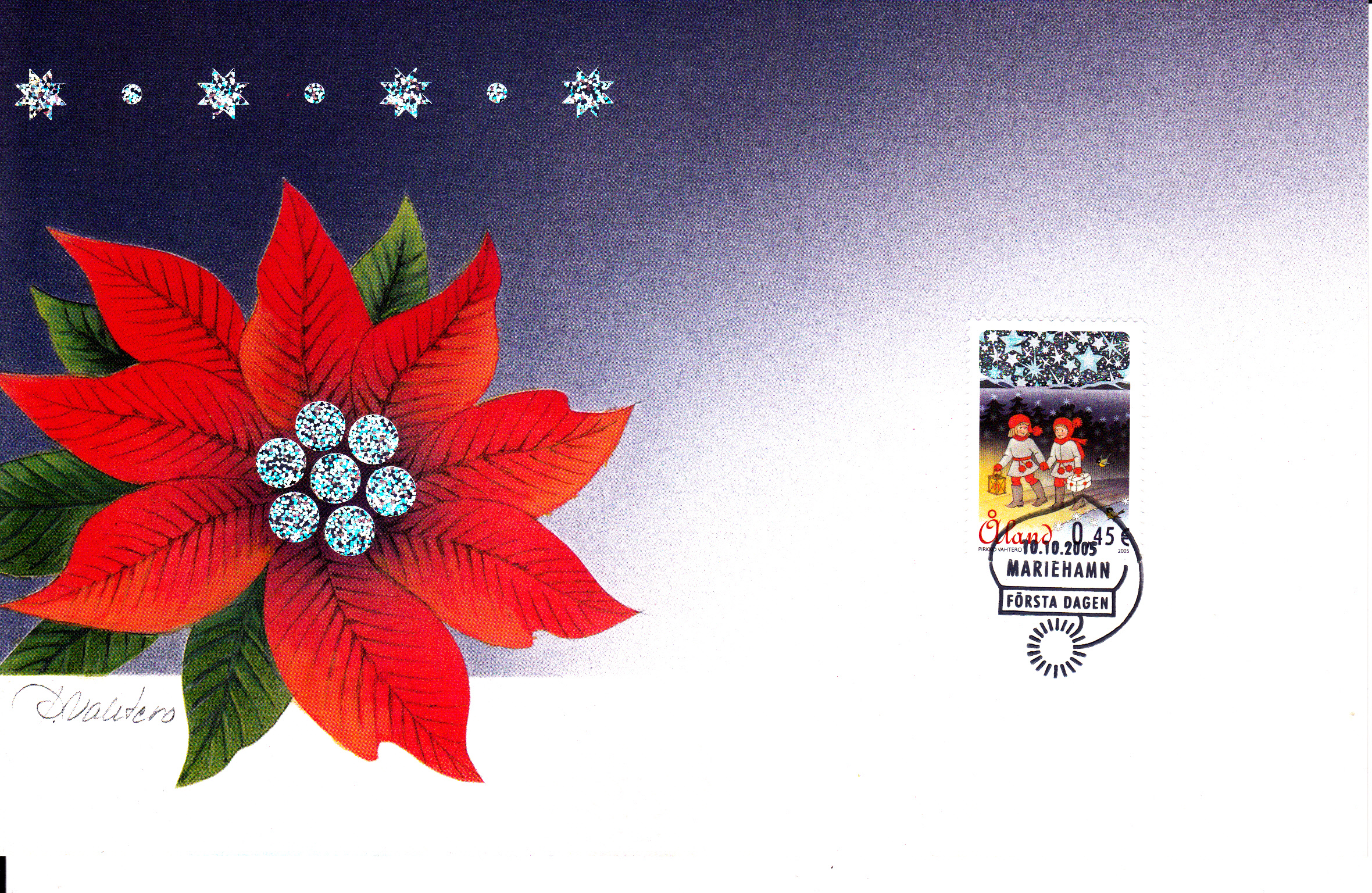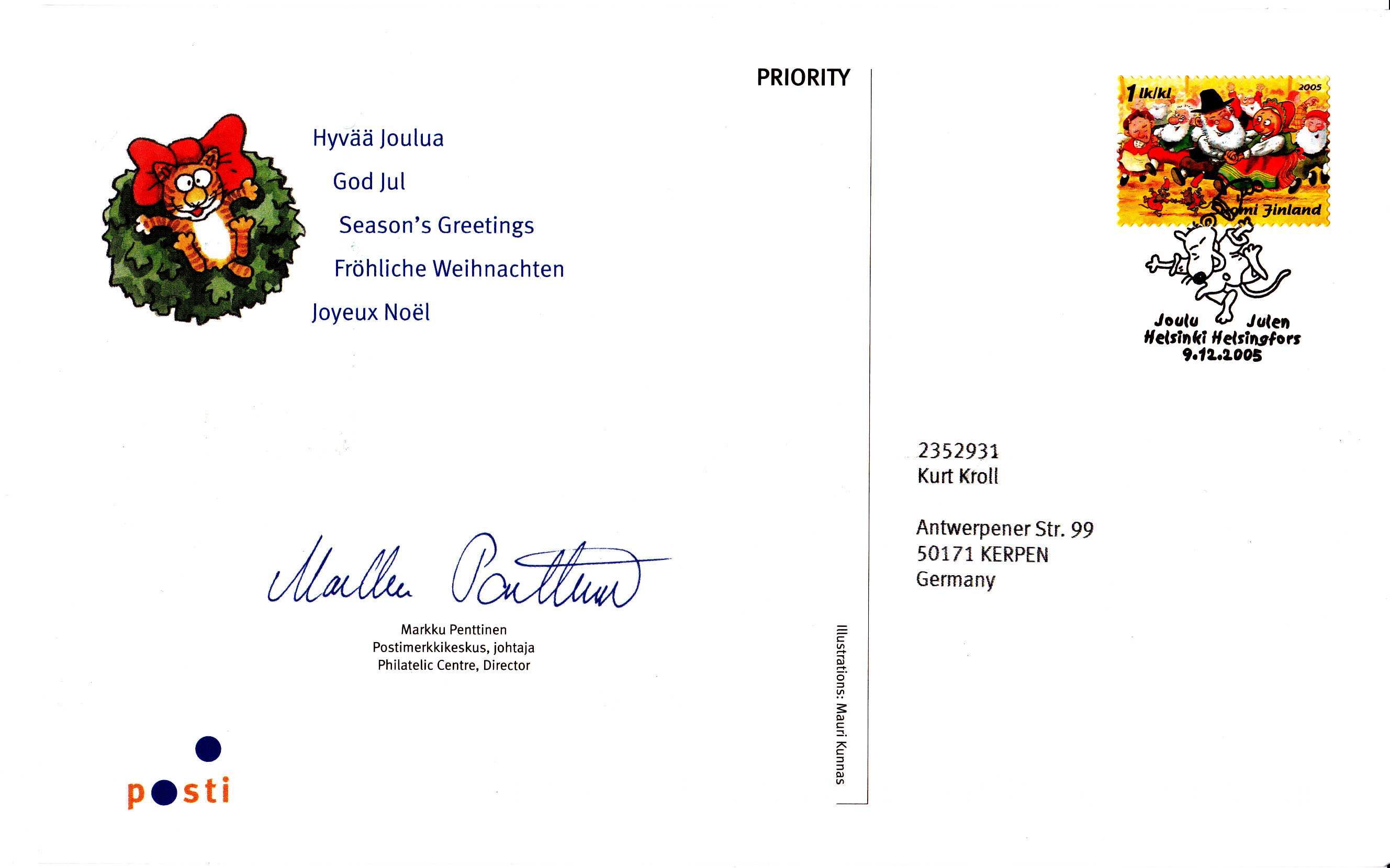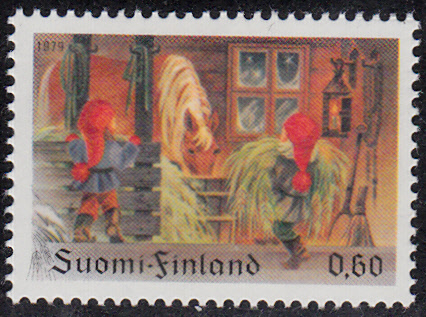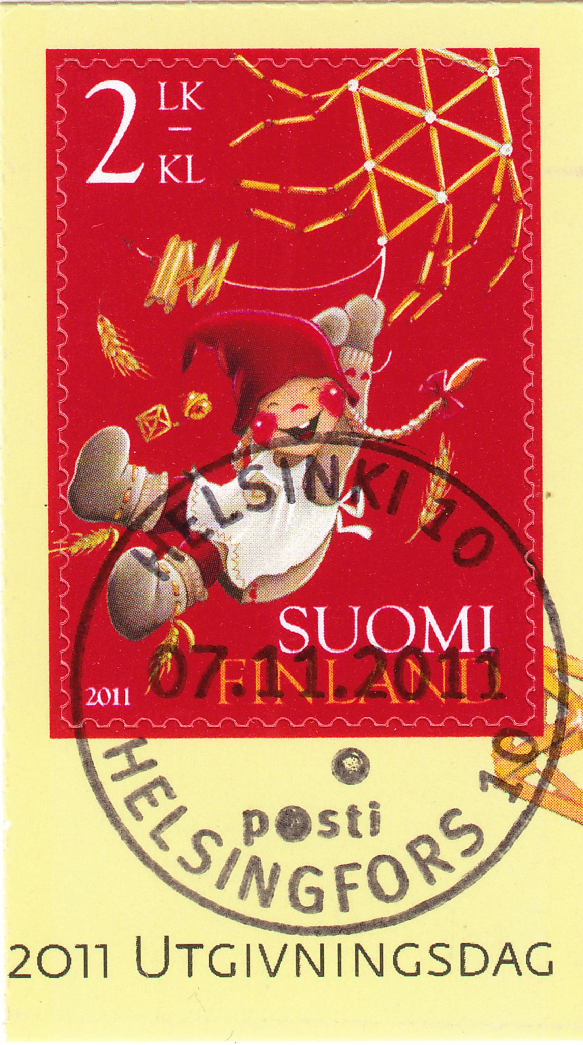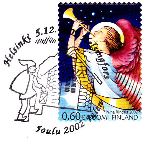 Auf einer der beiden Weihnachtsmarken 2005 aus Finnland sehen wir Weihnachtswichtel beim Tanzen. Hier wurde diese Marke auf einer Weihnachtskarte nach Deutschland als Porto benutzt. In Finnland und anderen nordischen Länder sind die Weihnachtswichtel als Helfer des Weihnachtsmannes weit verbreitet.