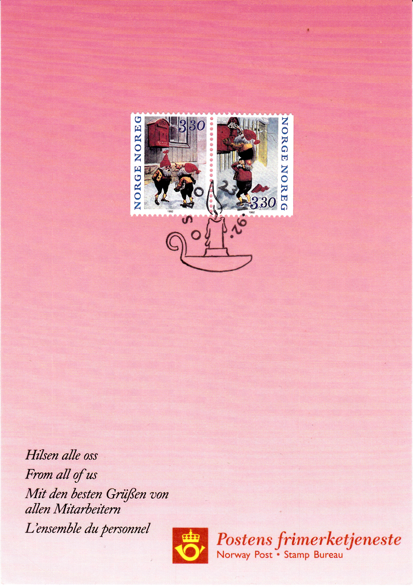 Die beiden gezeigten Marken MiNr 1112/13 sind zusammenhängend im Markenheftchen MiNr MH 19 erschienen. Hier ein solches Paar mit Ersttagstempel aus der Weihnachtskarte der norwegischen Post.