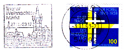 Auf den Trierer Weihnachtsmarkt machte ab 1987 für lange Jahre ein Maschinenwerbestempel aufmerksam, hier ein Beispiel aus dem Jahre 1993 mit neuer Postleitzahl 54292. Diesen Werbeeinsatz gibt es aus den frühen Jahren auch mit der alten PLZ 5500. Auch bei den Kennbuchstaben (beim gezeigten Stempel "mc") gibt es Unterscheidungen.