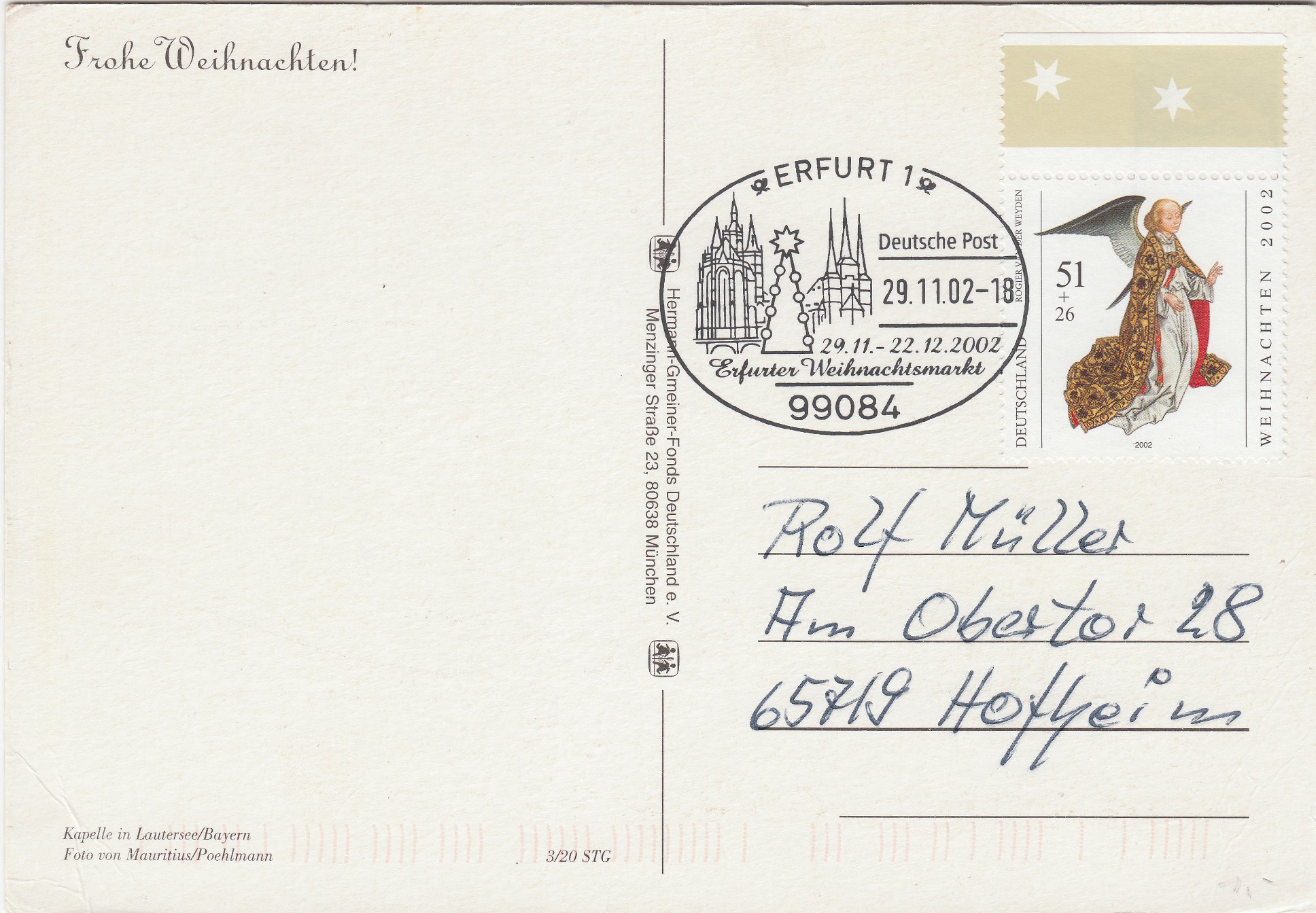 Hier ein Stempel vom 29.11.2002 als Eröffnungstag des Erfurter Weihnachtsmarktes 2002: