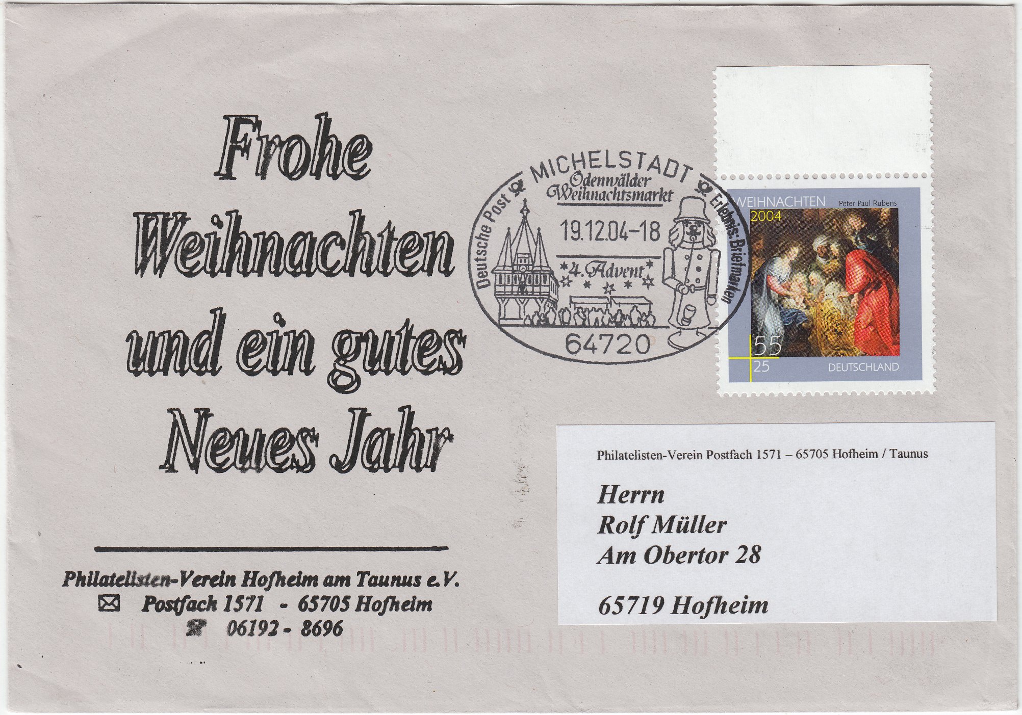 Als portorichtige Einzelfrankatur für das Postkartenporto in Höhe von 0,51 € diente dabei eine Weihnachtsmarke, MiNr. 2285. Da diese Ausgabe erst am 07.11.2002 erschien und die Portostufe von 0,51 € für eine Postkarte nur im Jahre 2002 galt dürfte es wohl gar nicht so einfach sein, einen solchen echt gelaufenen Beleg zu finden!!!
