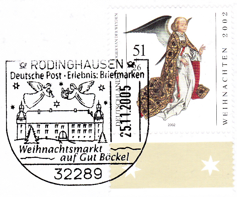 Sonderstempel aus Engelskirchen vom 21.12.2015 "30 Jahre Christkindpostfiliale". Im Stempelbild befinden sich vier Weihnachtsengel, die ein Banner tragen.