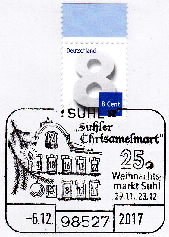 Sonderstempel zum 3- Sinsener Adventszauber am 10.12.2017. Im Stempelbild werden ein Binnenschiff auf dem Wesel-Datteln-Kanal und St. Nikolaus, der Schutzpatron der Seeleute, gezeigt.