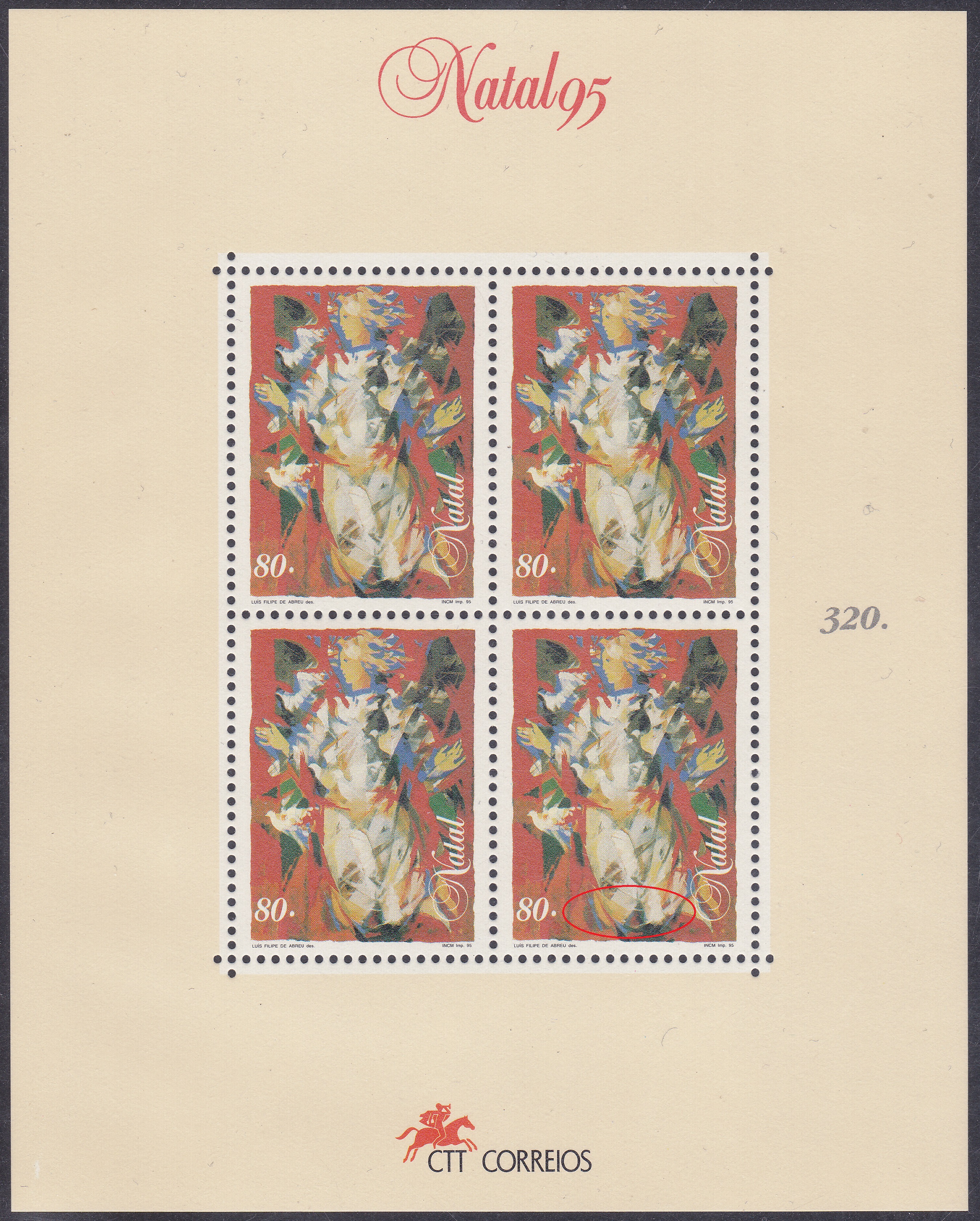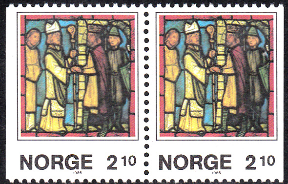 Die Weihnachtsmarken 1986 aus Norwegen zeigen Glasmalereien von Gabriel Kielland (1871-1960, Maler, Architekt und Glasmaler). Die Marken sind im Markenheftchen erschienen. Hier ein Paar 2,10 Kronen (MiNr 958 Dl/958 Dr) mit der Abbildung der Glasmalerei "Olaf Kyrre stiftet das Bistum Nidaros".