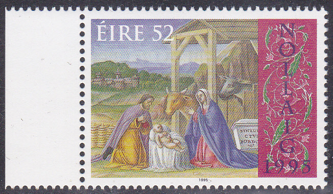 Auf der vierten und letzten der Weihnachtsmarken 1995 aus Irland (MINr 925) die Miniatur zu Christi Geburt.