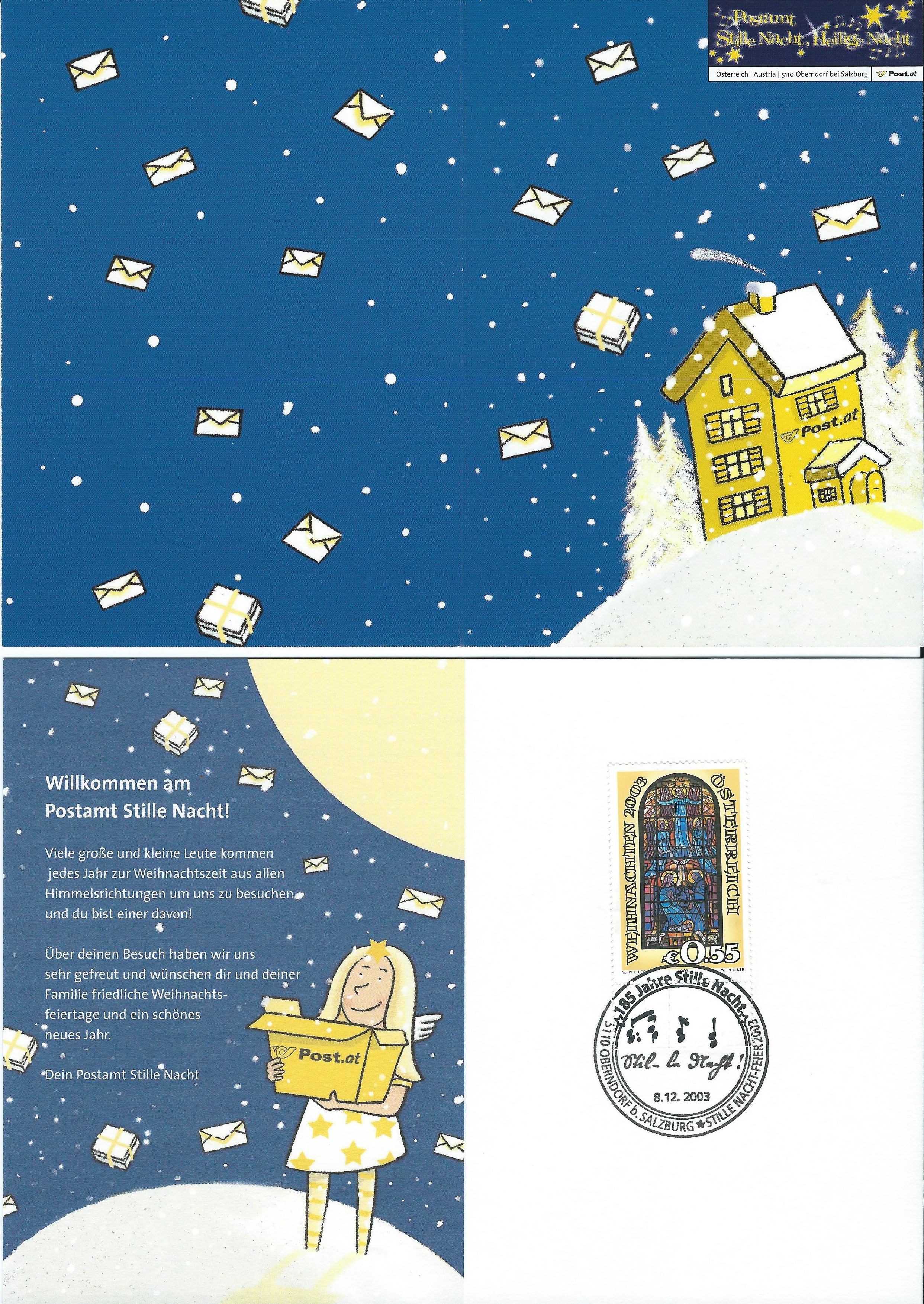 Den Anfang macht eine Klappkarte mit einer Weihnachtsmarke von 2003 und einem passenden Sonderstempel vom 8.12.2003 „185 Jahre Stille Nacht“. Das ist ein Sonderpostamt in Oberndorf bei Salzburg, welches immer zur Weihnachtszeit entsprechende Marken und Belege verkauft und einen Sonderstempel führt. Abgebildet habe ich die Innen- und Aussenseiten der Klappkarte.